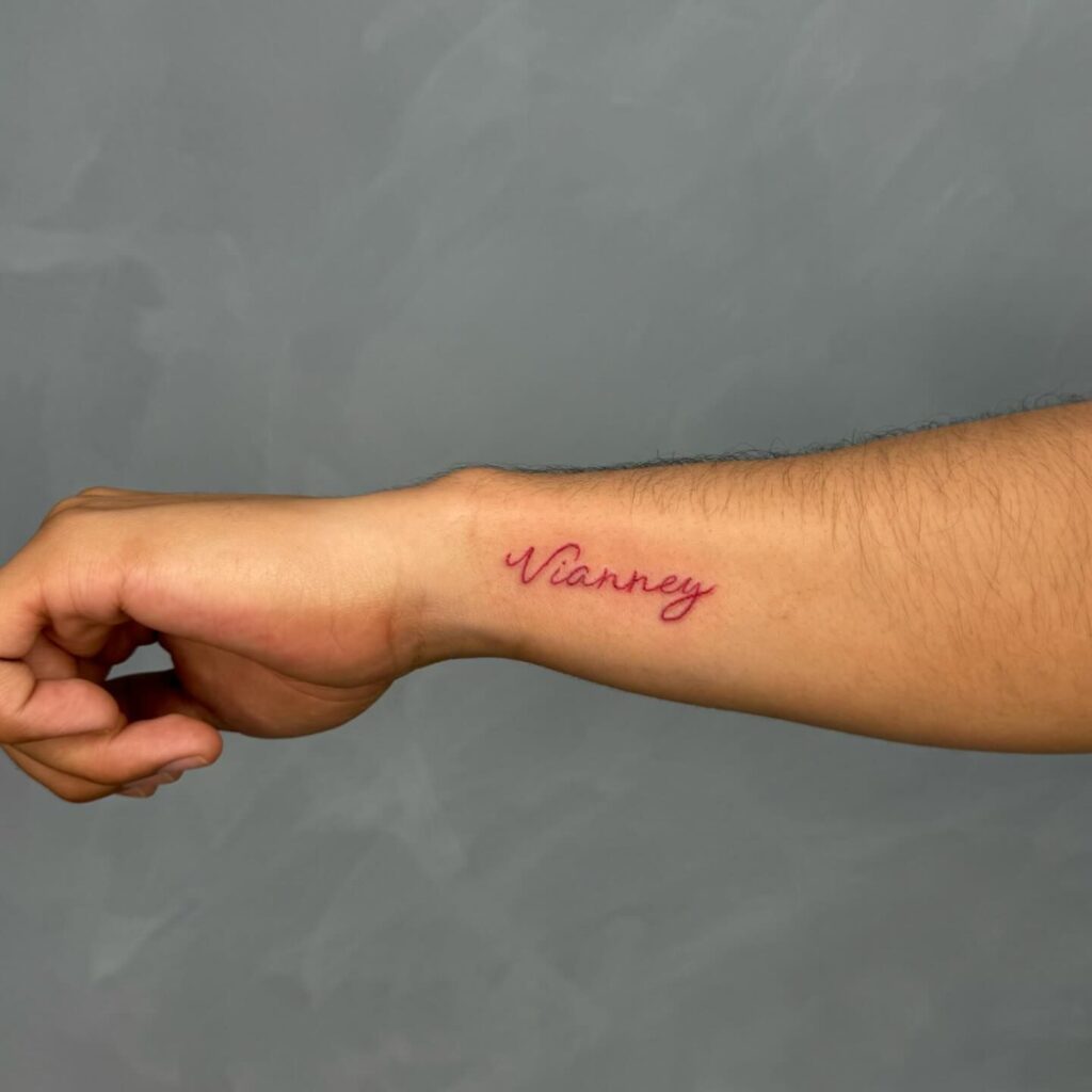 This tattoo features the name elegantly written in red cursive script on the forearm. The use of red ink adds a unique and bold touch to the minimalist design, making it stand out while remaining simple and refined.
