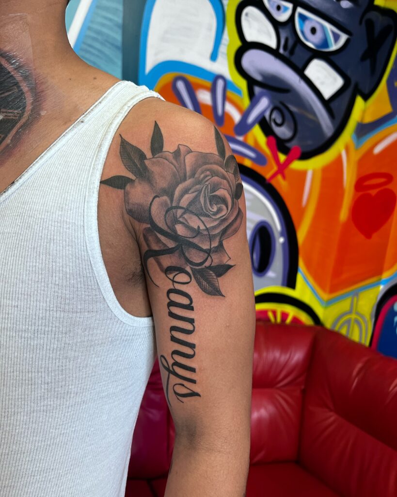 Rose Shoulder Name Tattoo