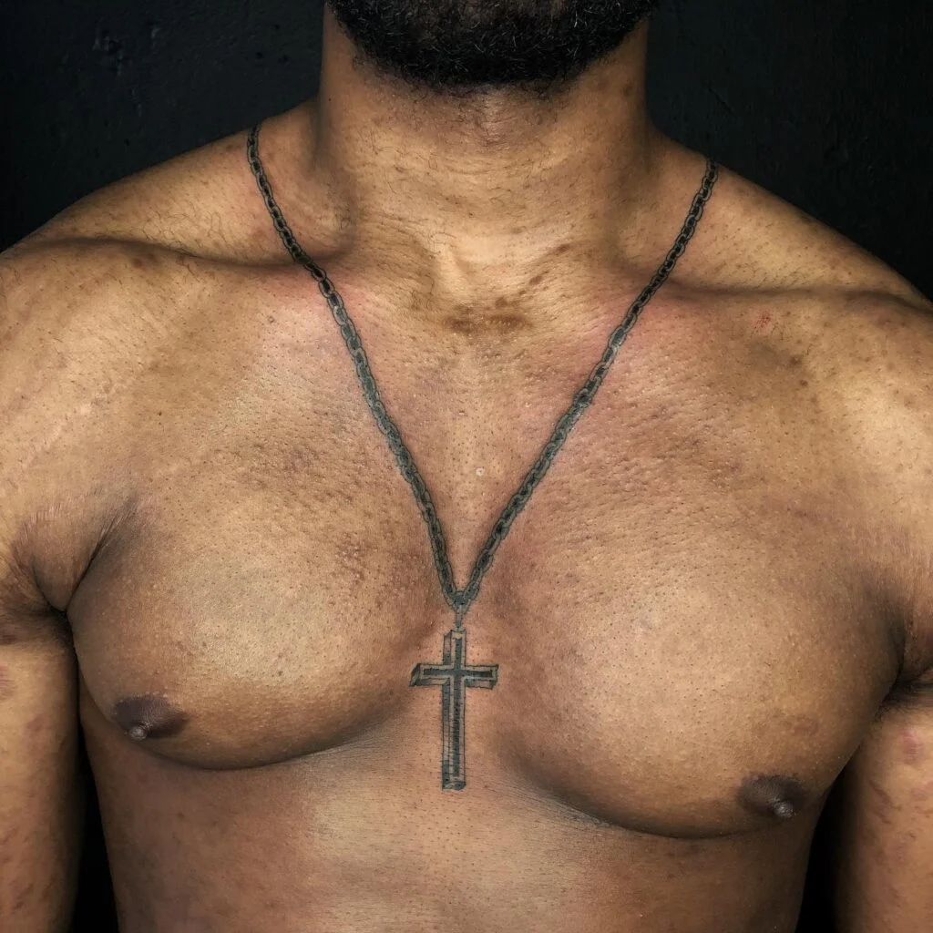 The detailed shading along the chain links and the cross itself enhances the 3D effect, making the tattoo appear like a real, weighty necklace. It’s a powerful piece that blends religious symbolism with personal strength and cultural roots.