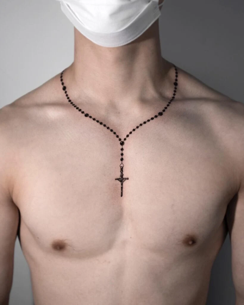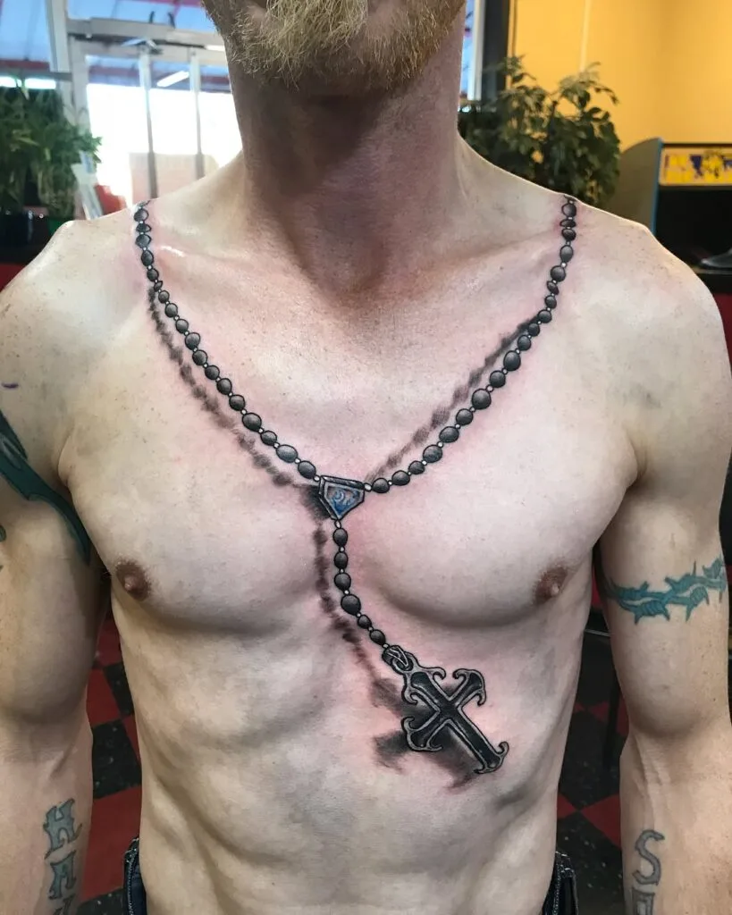 This hyper-realistic tattoo creates the powerful illusion of a rosary draped across the chest. Dark beaded strands curve naturally over the shoulders and chest, leading to a triangular connector and a large ornamental cross.