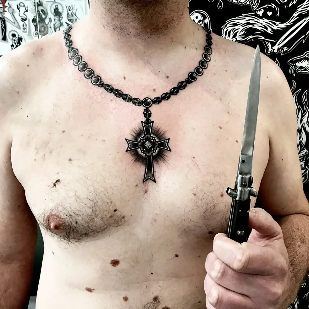 This tattoo replicates a classic chain necklace with a simple yet powerful cross pendant hanging at the center of the chest. The shading and highlights along the chain links create a realistic, worn-metal effect, while the cross is solid and clean, giving it a timeless look.