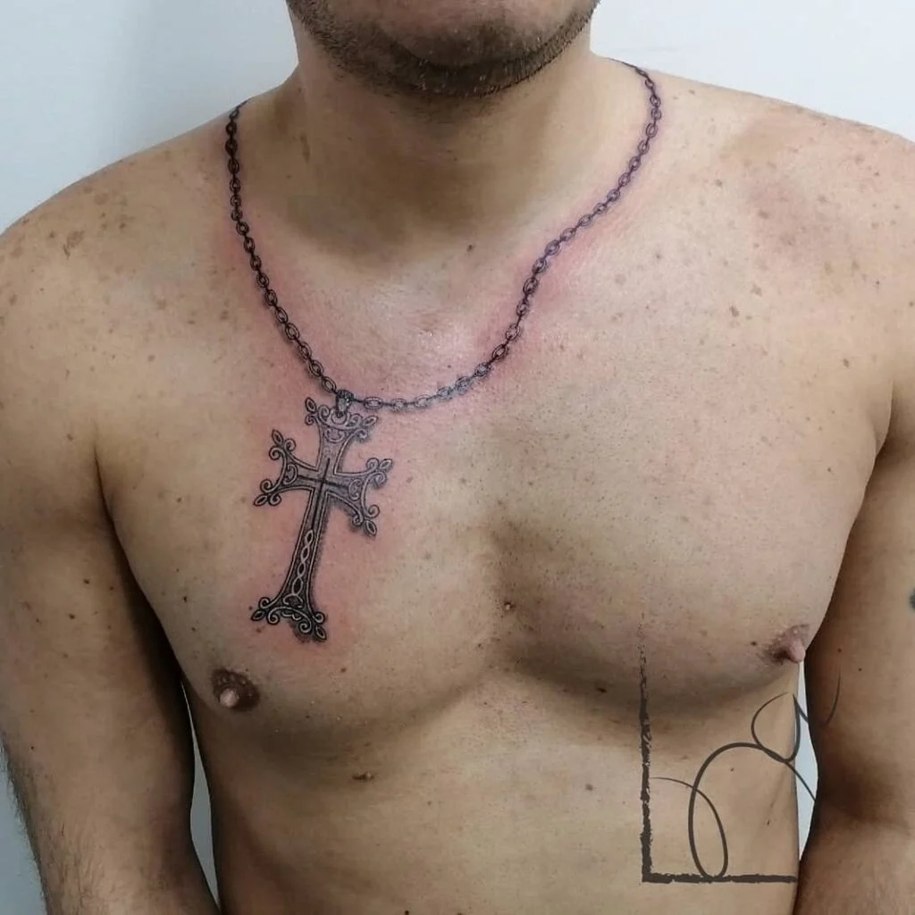 This tattoo mimics a fine chain necklace that drapes naturally across the collarbone, featuring an ornate cross pendant hanging just over the heart. The cross is beautifully detailed with delicate filigree patterns and crowned with a subtle regal touch.