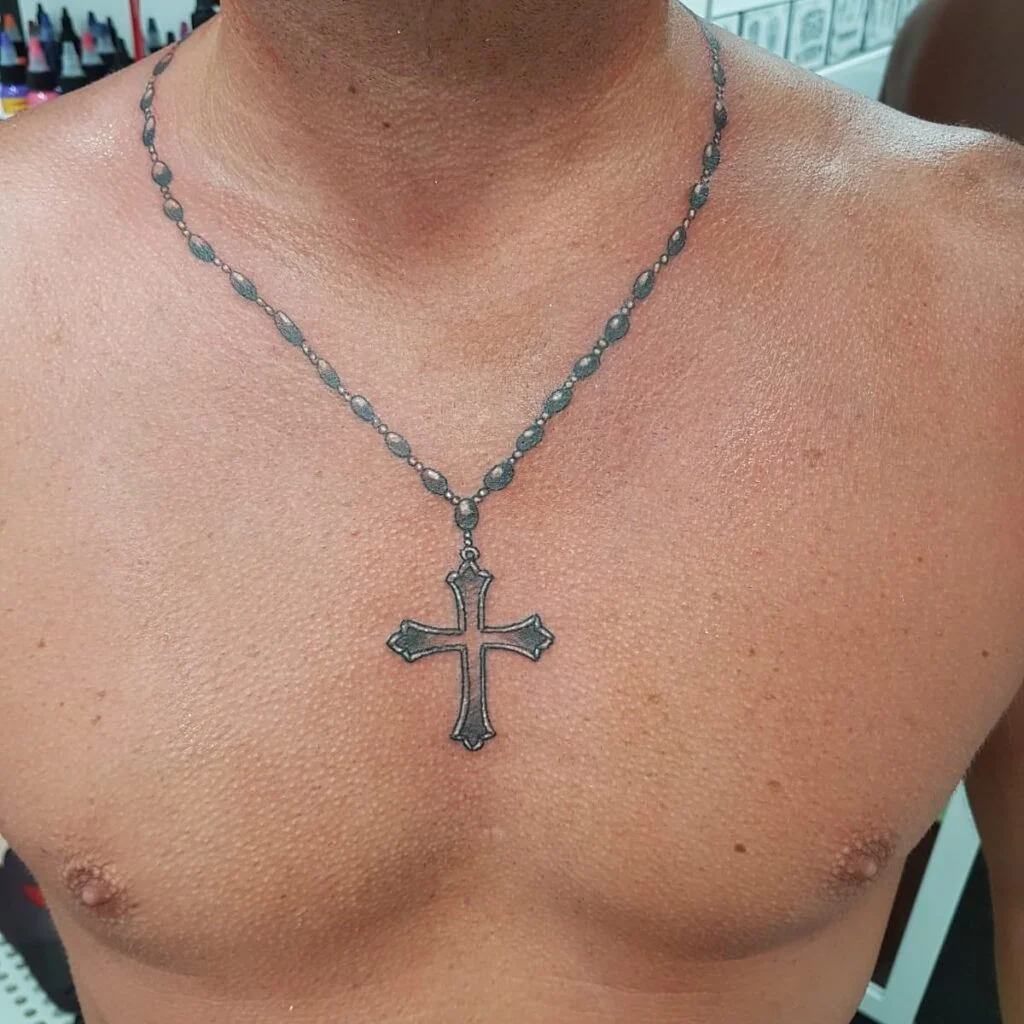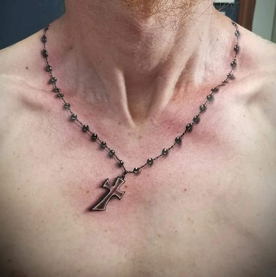 This tattoo captures the look of a rosary necklace draped naturally across the chest with stunning realism. Each bead is meticulously shaded to give a three-dimensional effect, and the drop-down cross appears to rest gently on the skin.