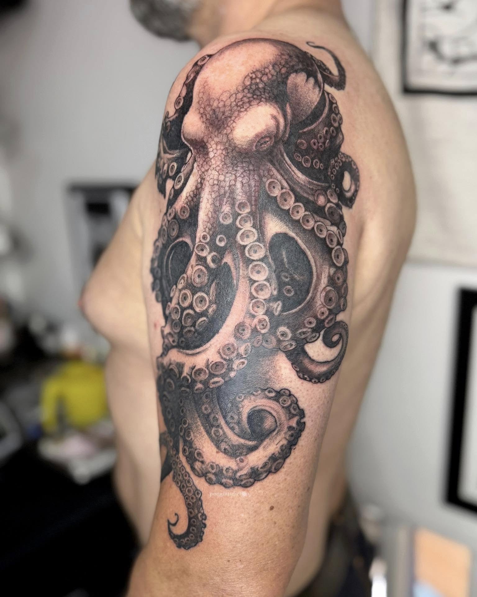 This large black and grey octopus tattoo wraps around the upper arm and shoulder, using smooth shading to build depth and texture.