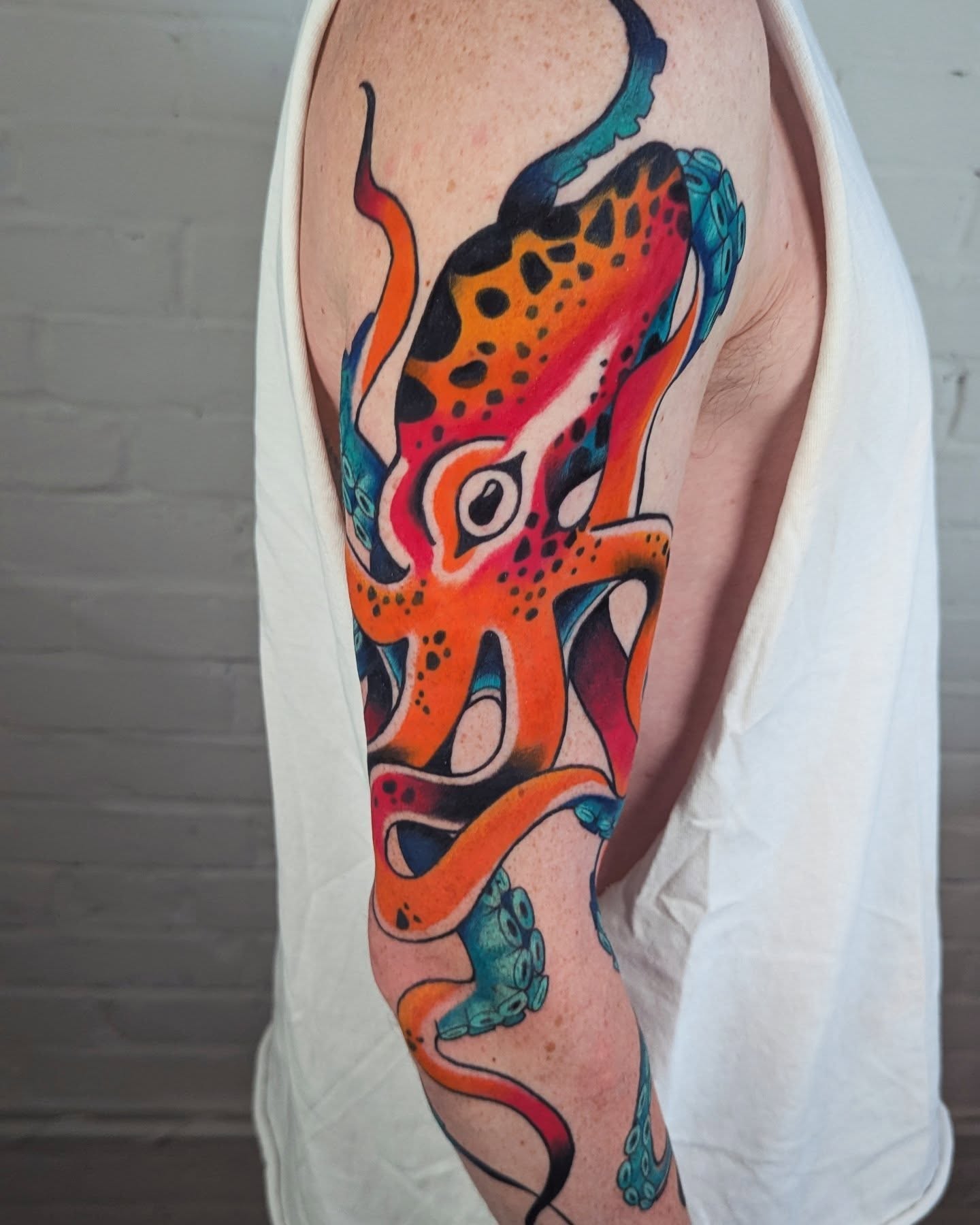 This bright octopus tattoo covers the upper arm with a bold mix of orange, teal, red, and black, giving it a strong neo-traditional look.