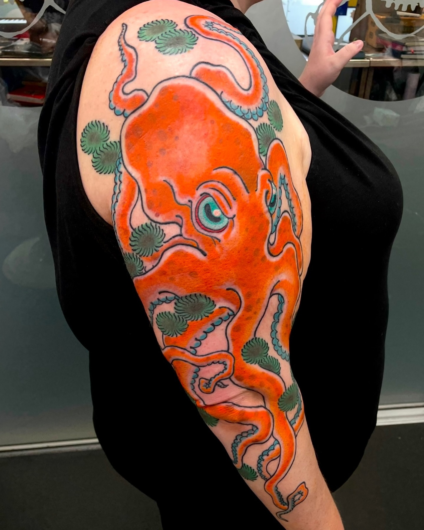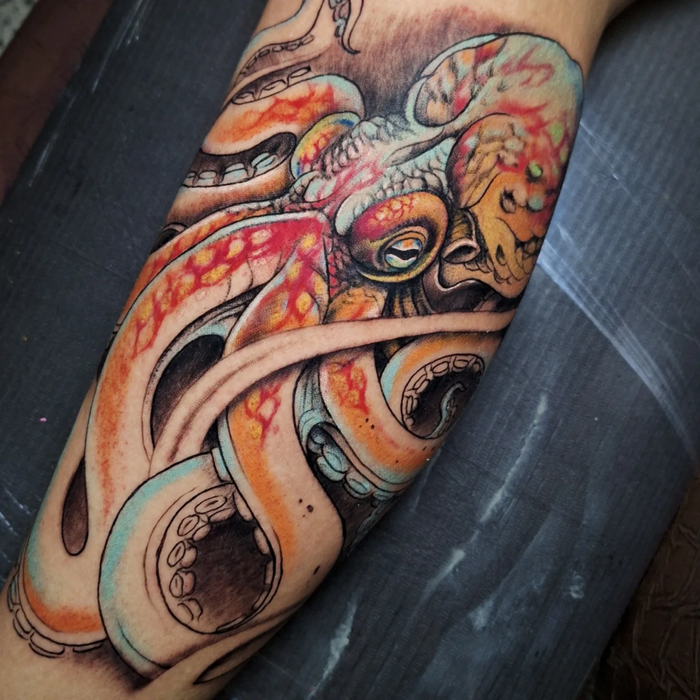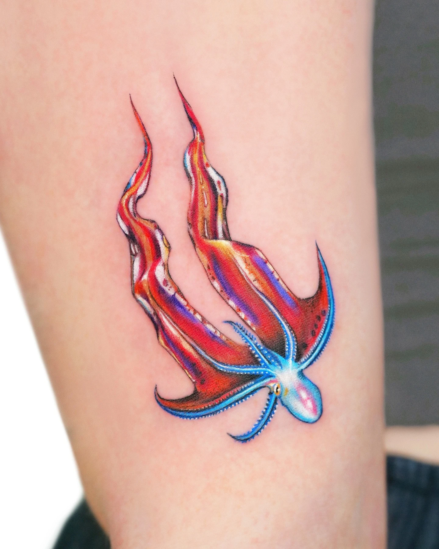 The artist kept the suction cups and details minimal, focusing on smooth curves and clean color transitions instead of realism. The thick black outline adds a classic tattoo feel, helping the colors pop against the skin.