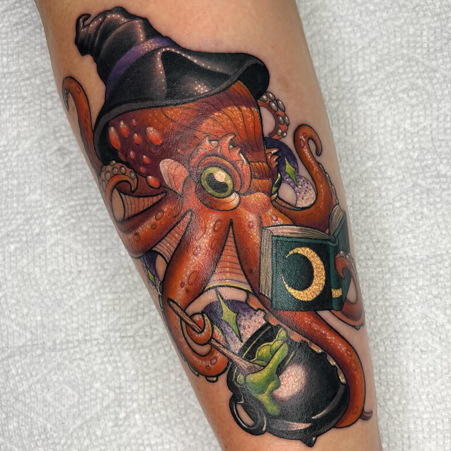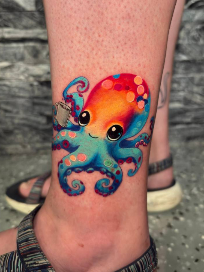It’s a fun, light-hearted take on an octopus tattoo, perfect for someone who loves bold color and a bit of character in their ink.