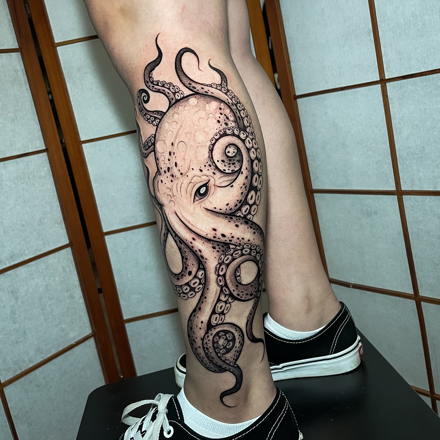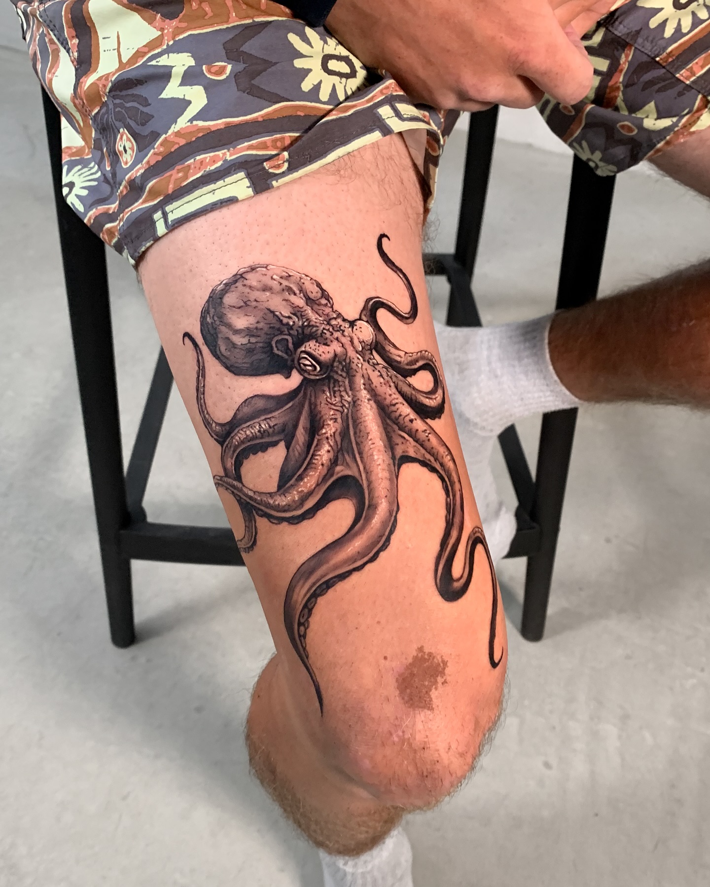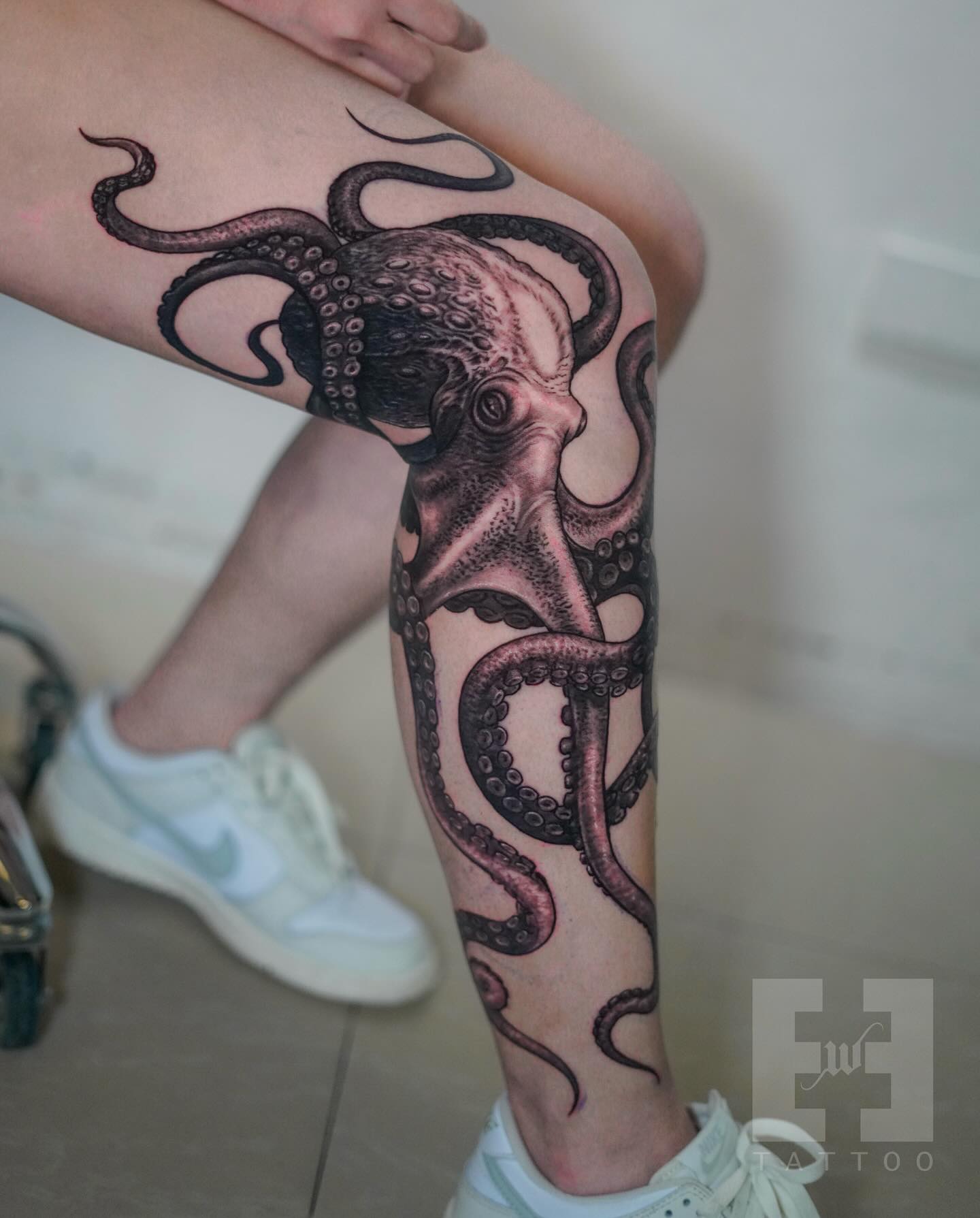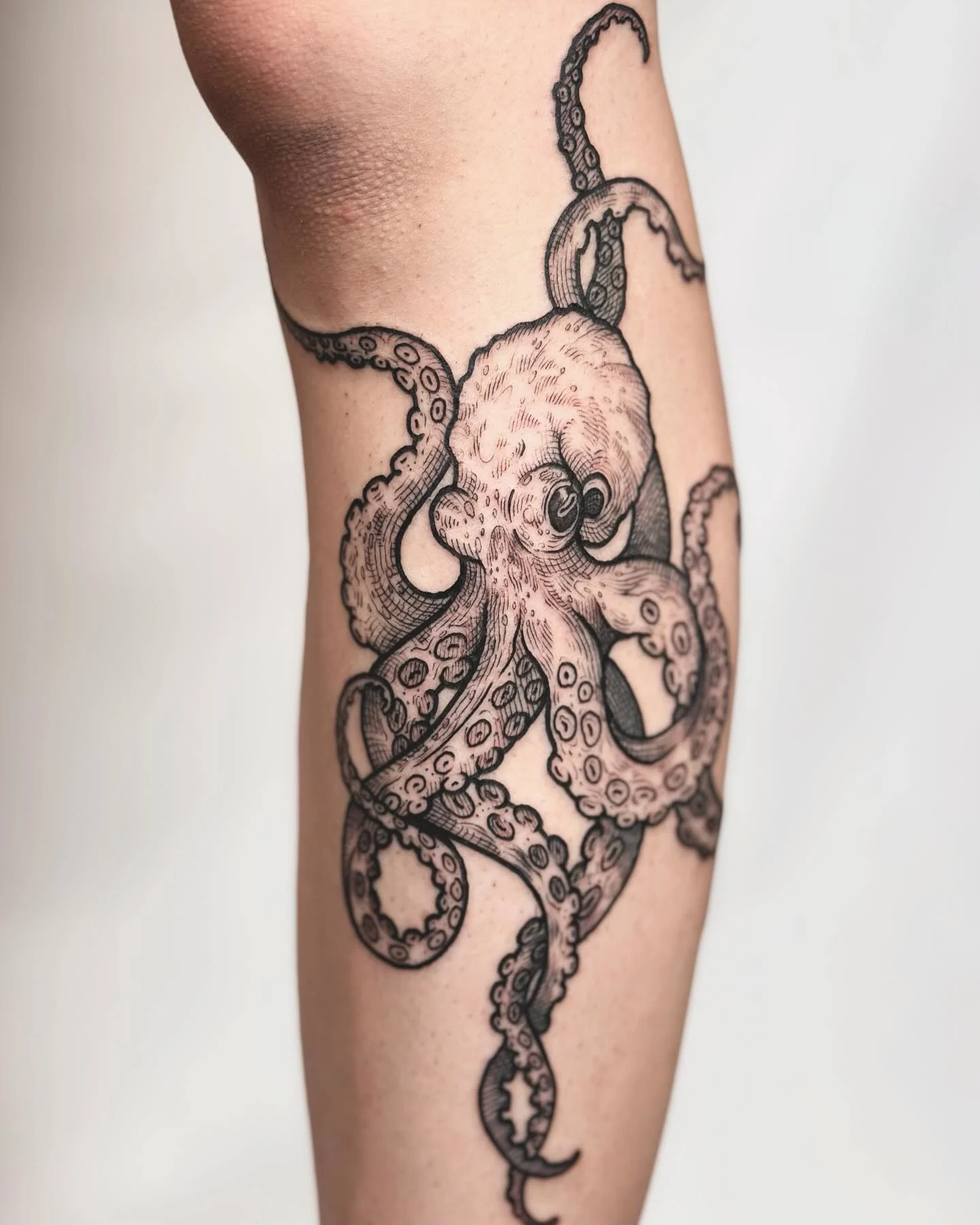 The octopus’s body sits over the knee, making the joint part of the design, while the tentacles stretch up the thigh and down the calf in smooth, natural curves.
