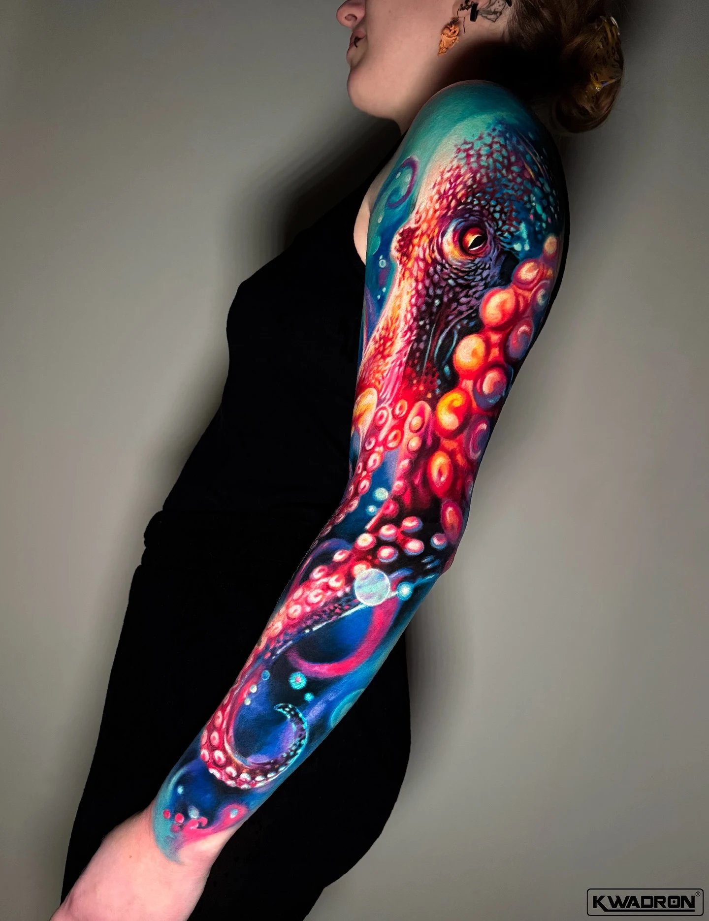This full-sleeve tattoo features a large, hyper-saturated octopus that wraps from the shoulder to the wrist, using neon blends of teal, magenta, coral, and deep blue.