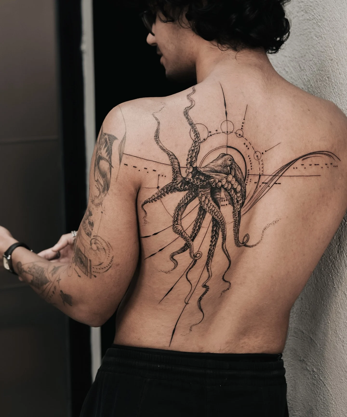 This large back tattoo combines a realistic octopus with fine-line geometric elements, creating a design that feels both organic and technical.