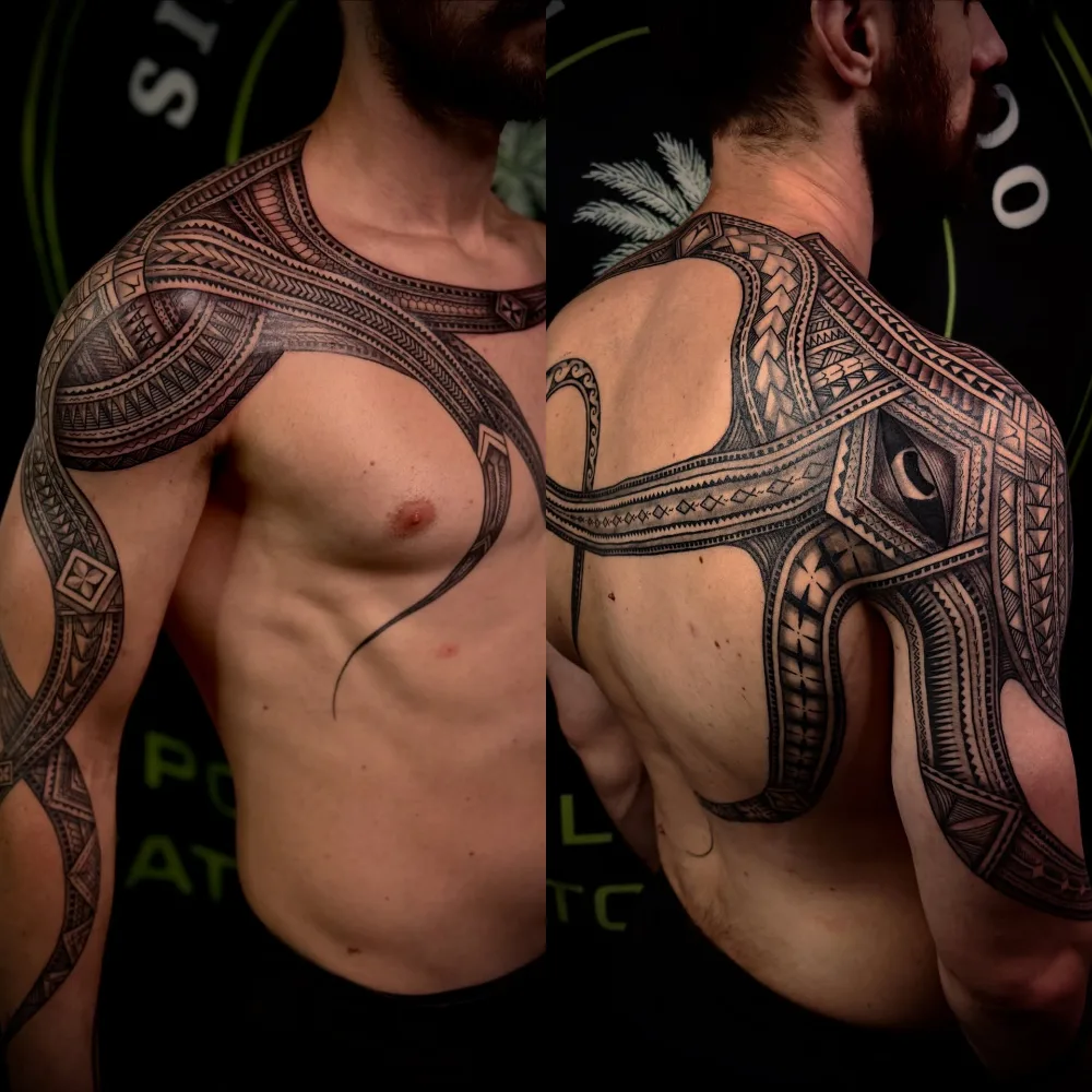 This large Polynesian-style octopus tattoo stretches across the back, shoulder, and upper arm, using bold tribal linework and traditional geometric patterns instead of realistic shading.