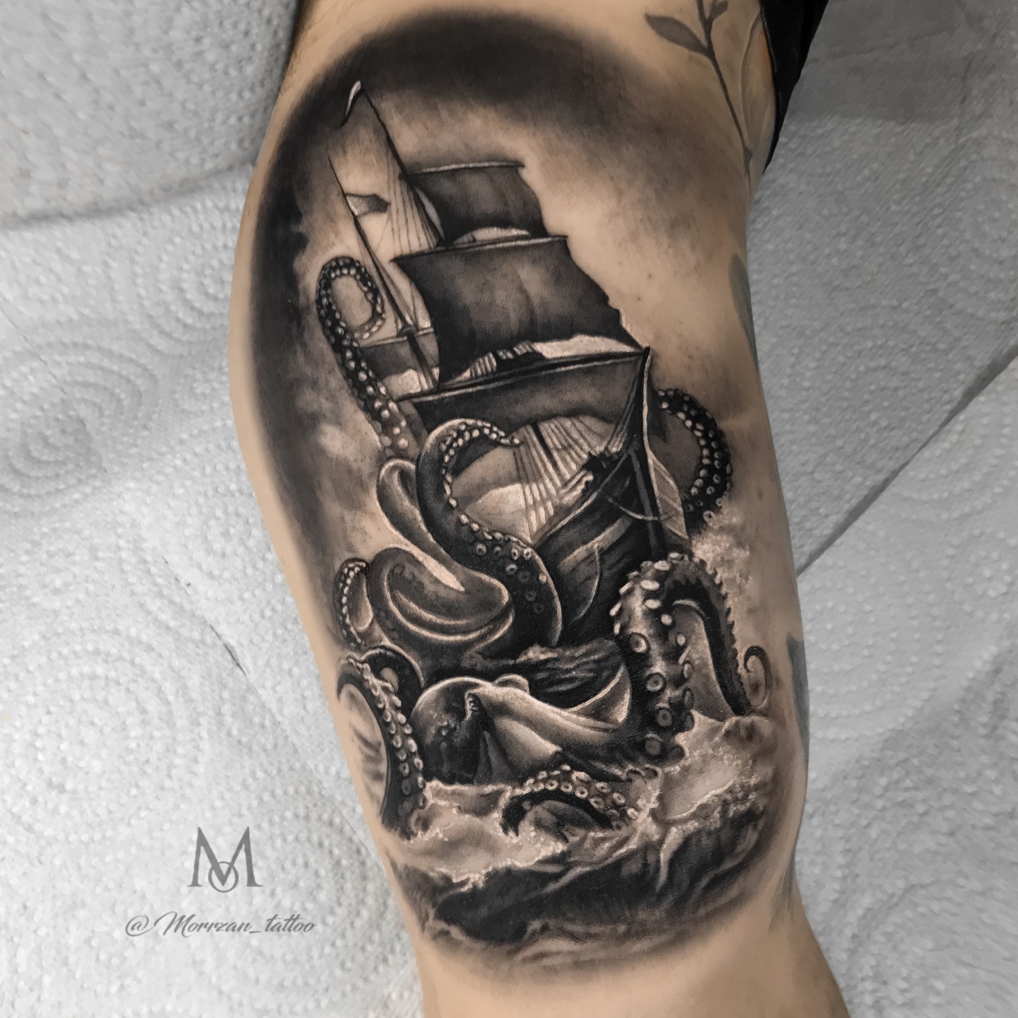 The octopus stretches across the chest and shoulder, with long curling arms that pull the ship down into crashing waves.