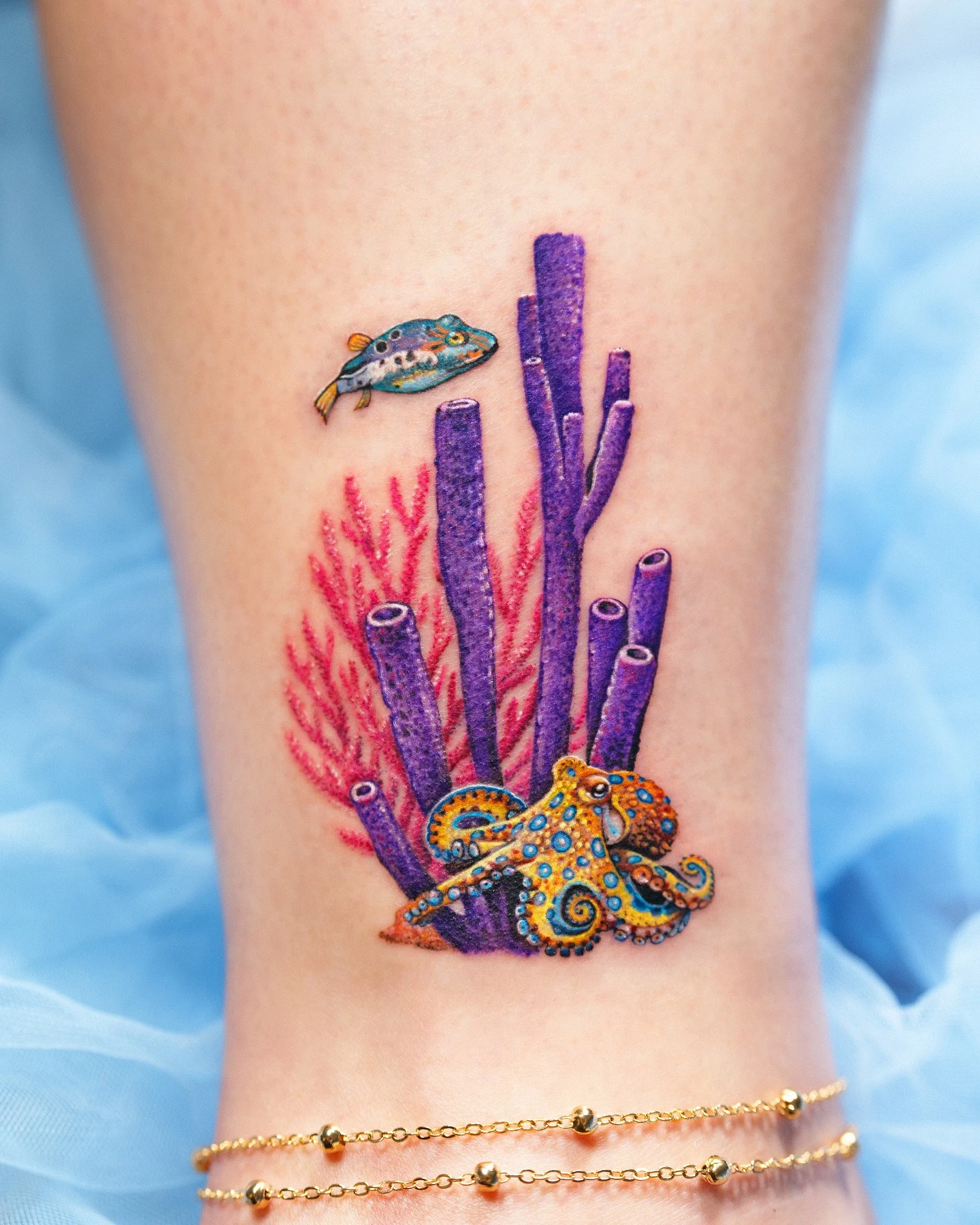 Its compact size makes it a perfect ankle or wrist tattoo for someone who wants a playful underwater design with lots of color and tiny details.