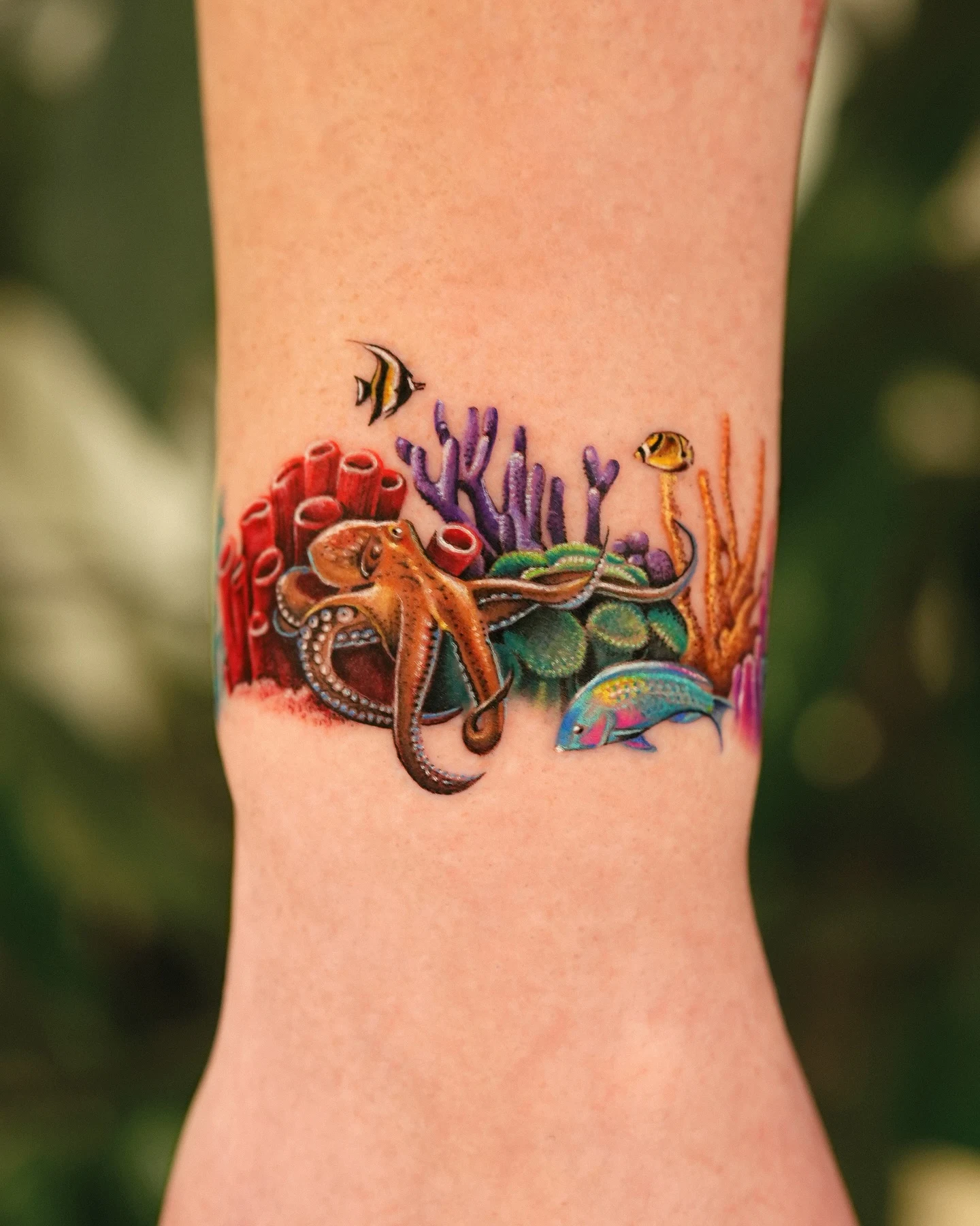 Its bracelet-style layout makes the tattoo feel like a wearable ocean landscape, perfect for someone who loves marine life in a compact, colorful format.