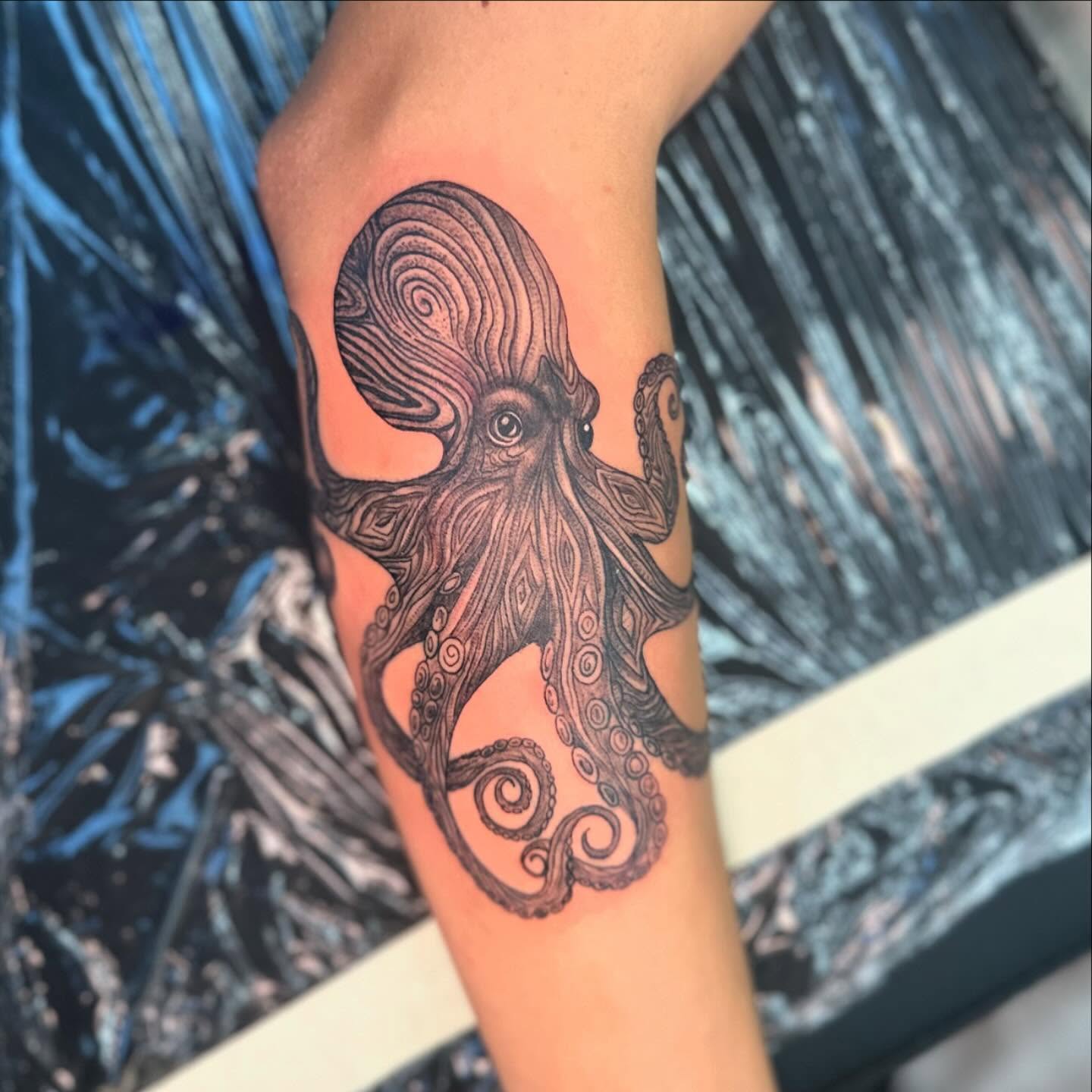 This blackwork octopus tattoo stretches from the upper arm to the forearm, using fine dot-shading and bold linework to build depth.
