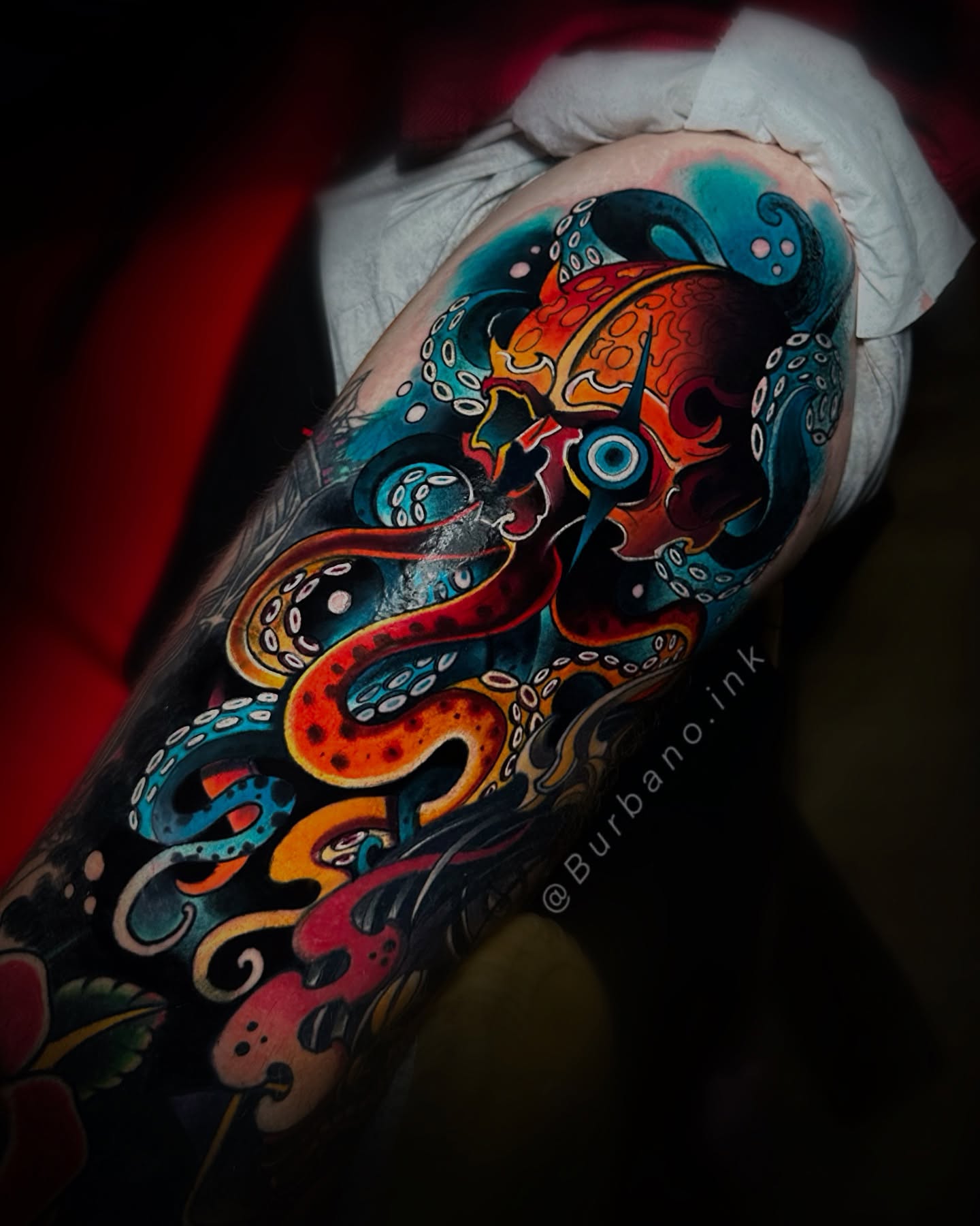Bright Red Octopus Thigh Tattoo