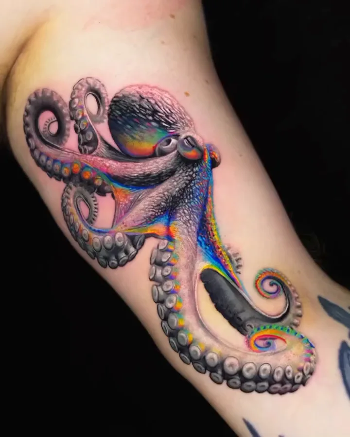 This tattoo blends realistic shading with unexpected rainbow color accents, giving the octopus a vibrant, bioluminescent look.
