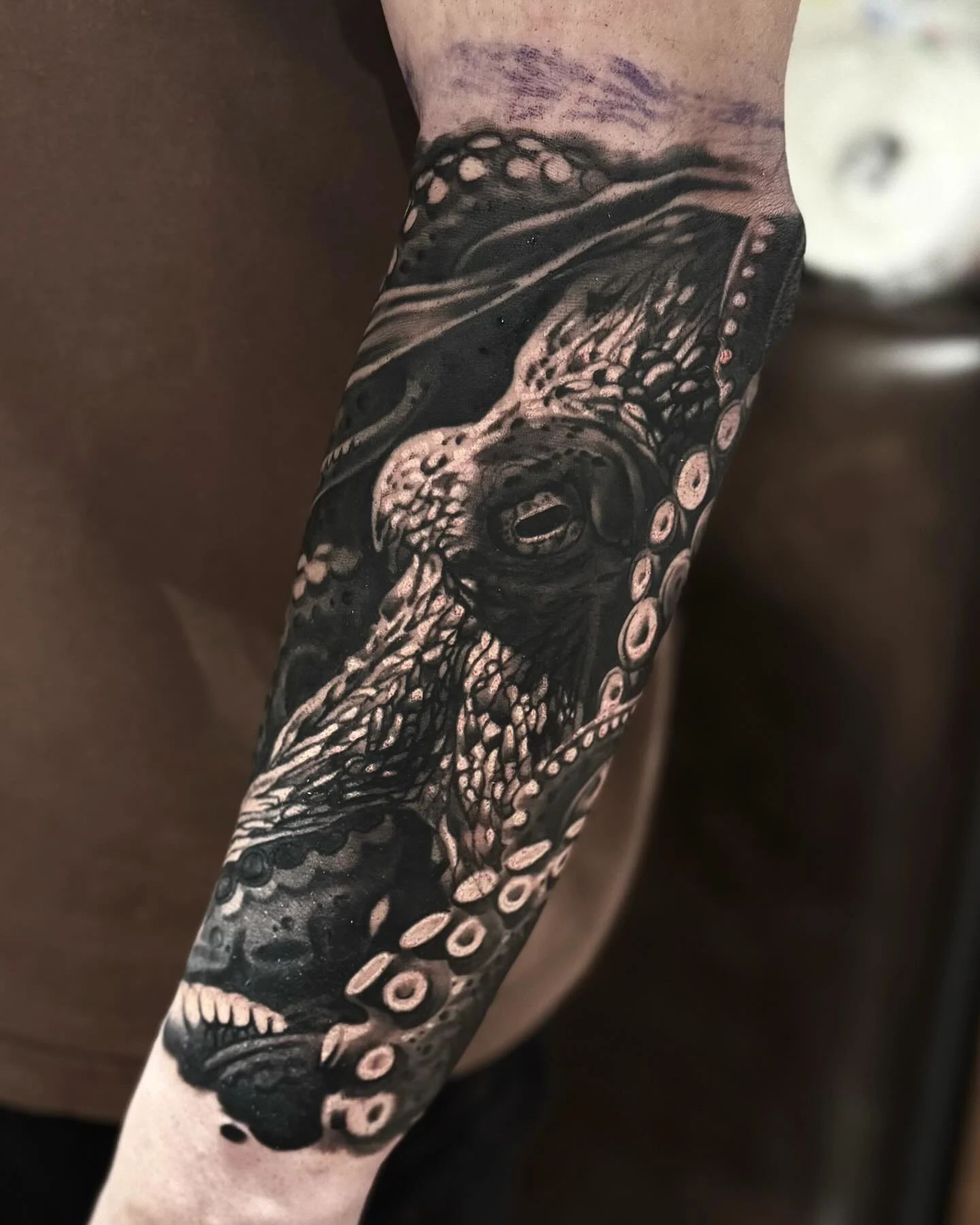 Heavy black sections under the limbs make the lighter areas stand out, especially the suction cups and eye. The tentacles extend past the forearm’s edge, making the design feel larger than its placement.
