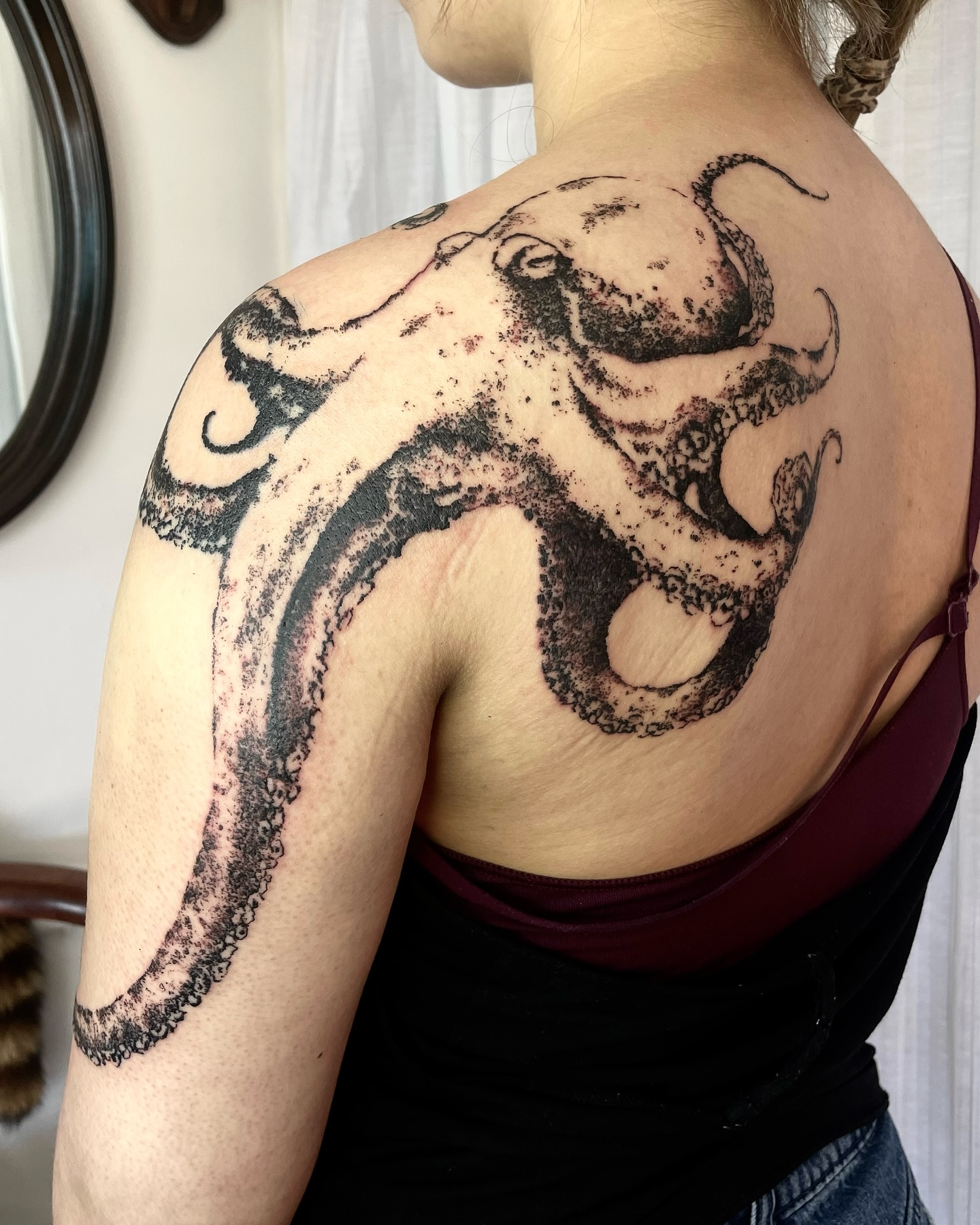 This shoulder and upper-back tattoo features an octopus created almost entirely with dotwork and loose, broken line shading.
