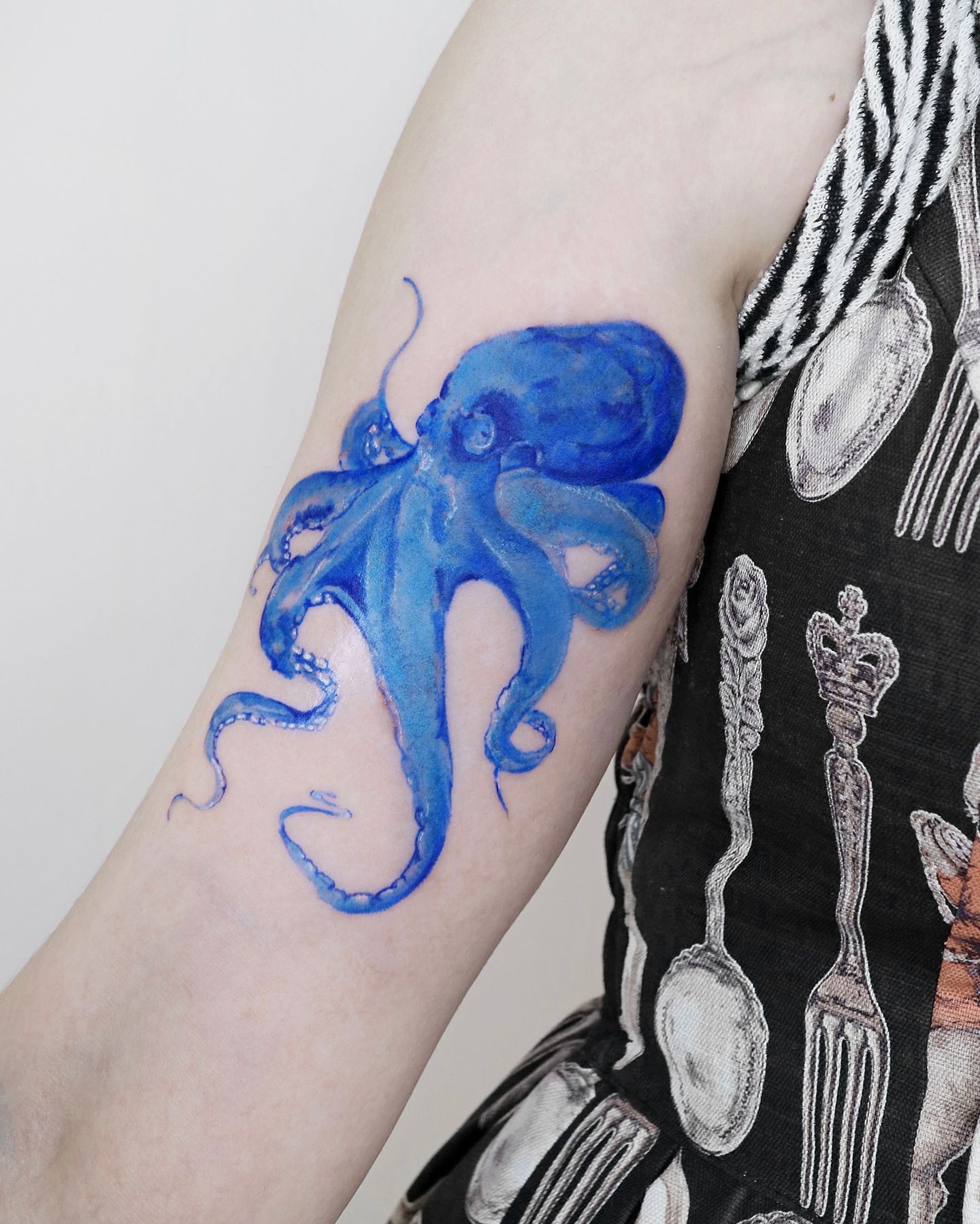 This tattoo features a bright blue octopus that looks almost painted onto the skin.