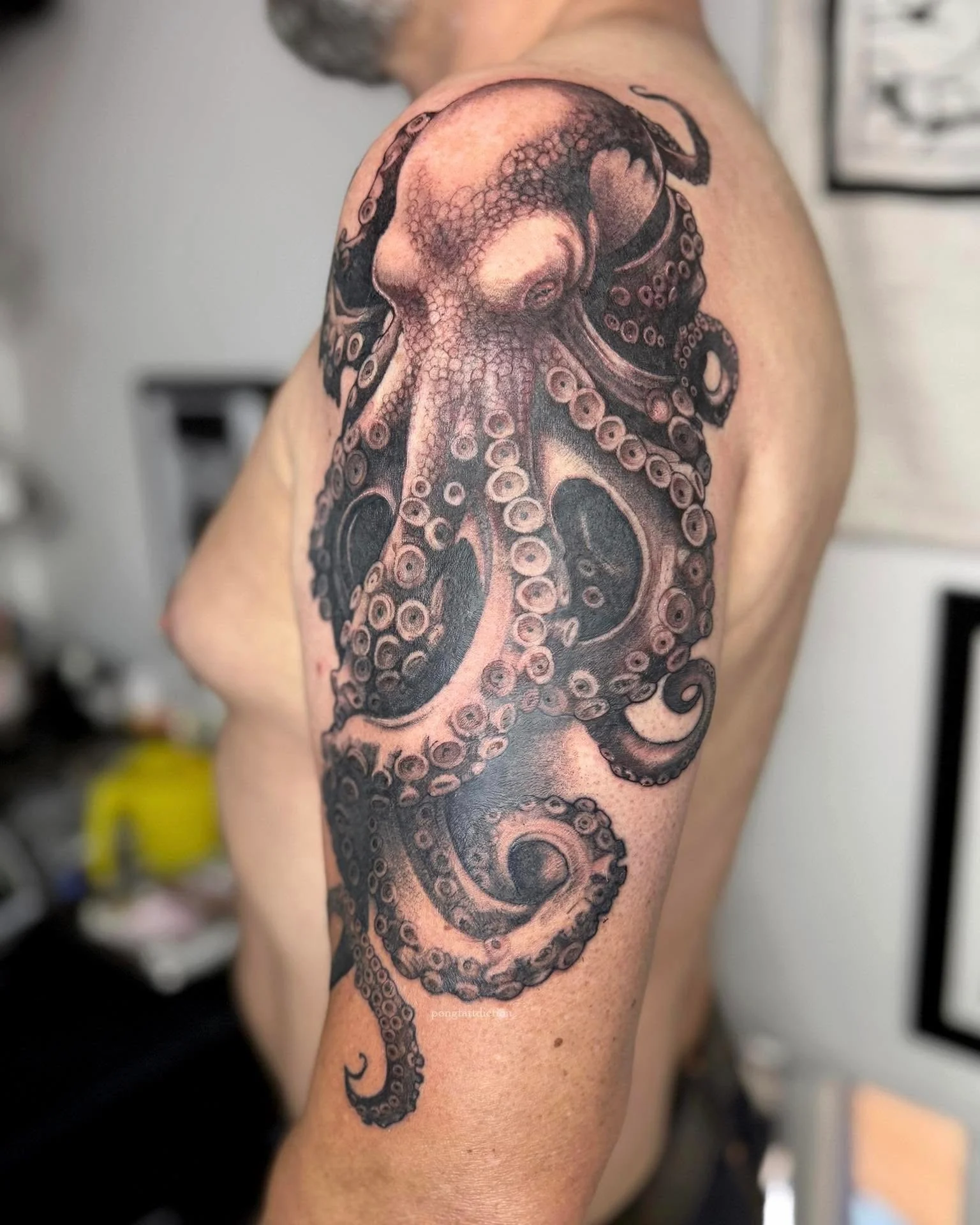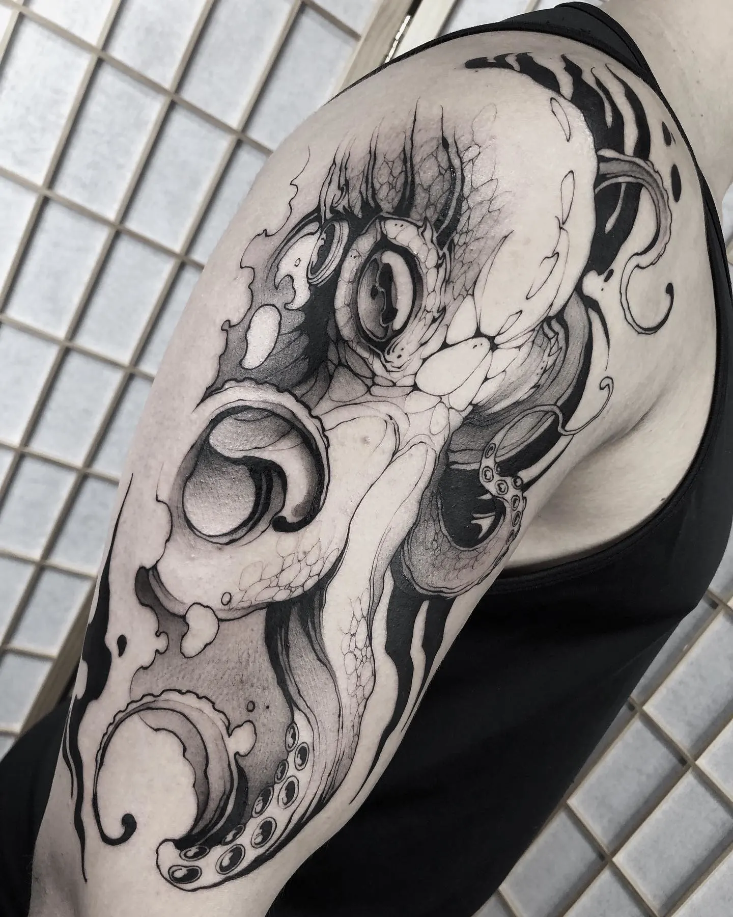 This large black and grey octopus tattoo wraps around the upper arm and shoulder, using smooth shading to build depth and texture.