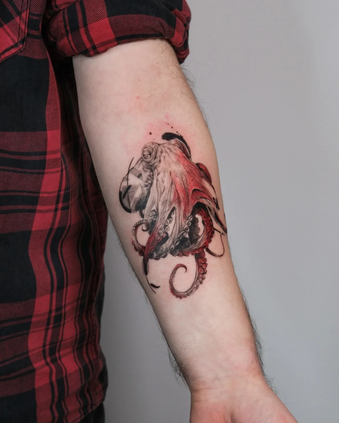 Fine strokes and scattered splatters add motion, almost like the octopus is emerging from a brushstroke. The tentacles curl in loose, natural shapes, keeping the design dynamic without overcrowding the arm.