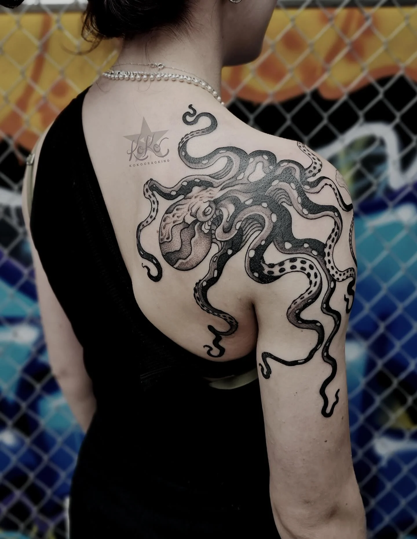 This black and grey octopus tattoo spreads across the upper back and shoulder, using bold outlines and soft dot-shading to create depth without heavy realism.