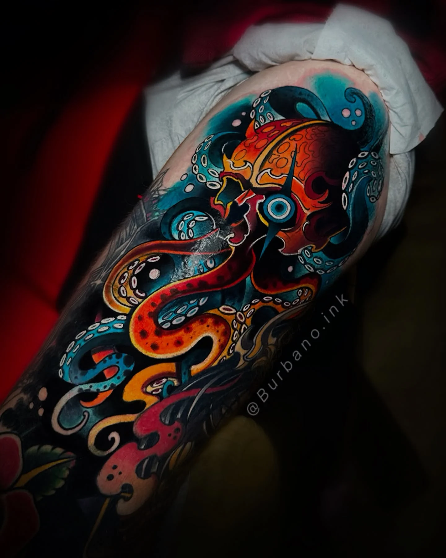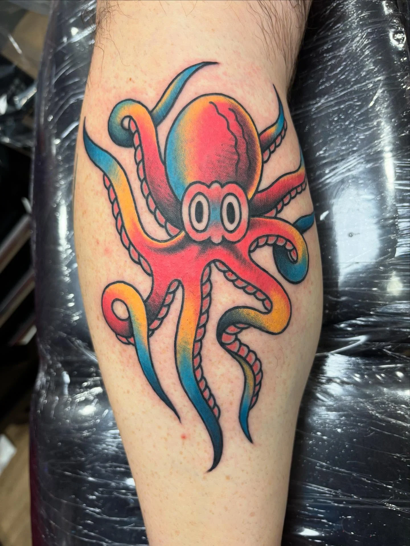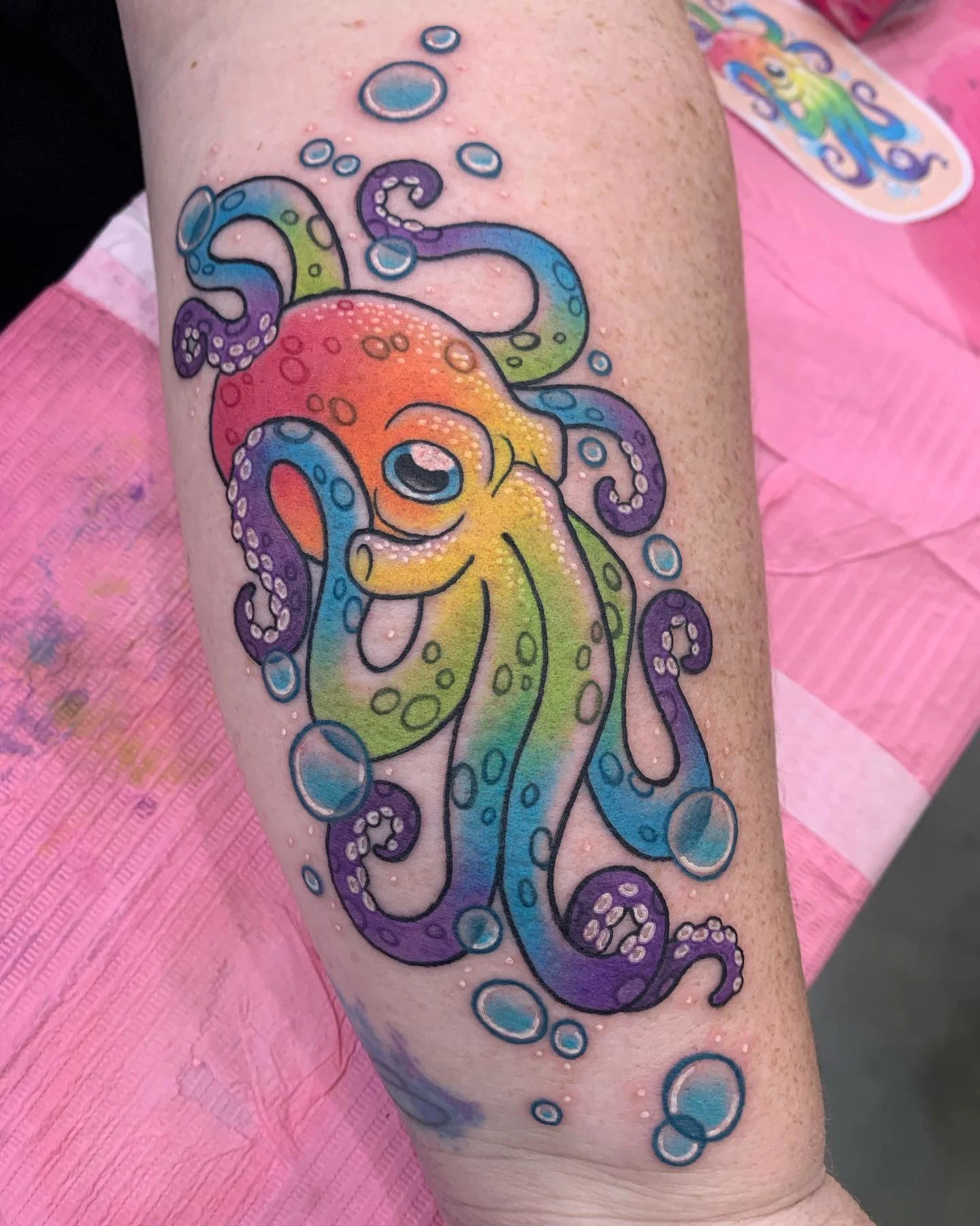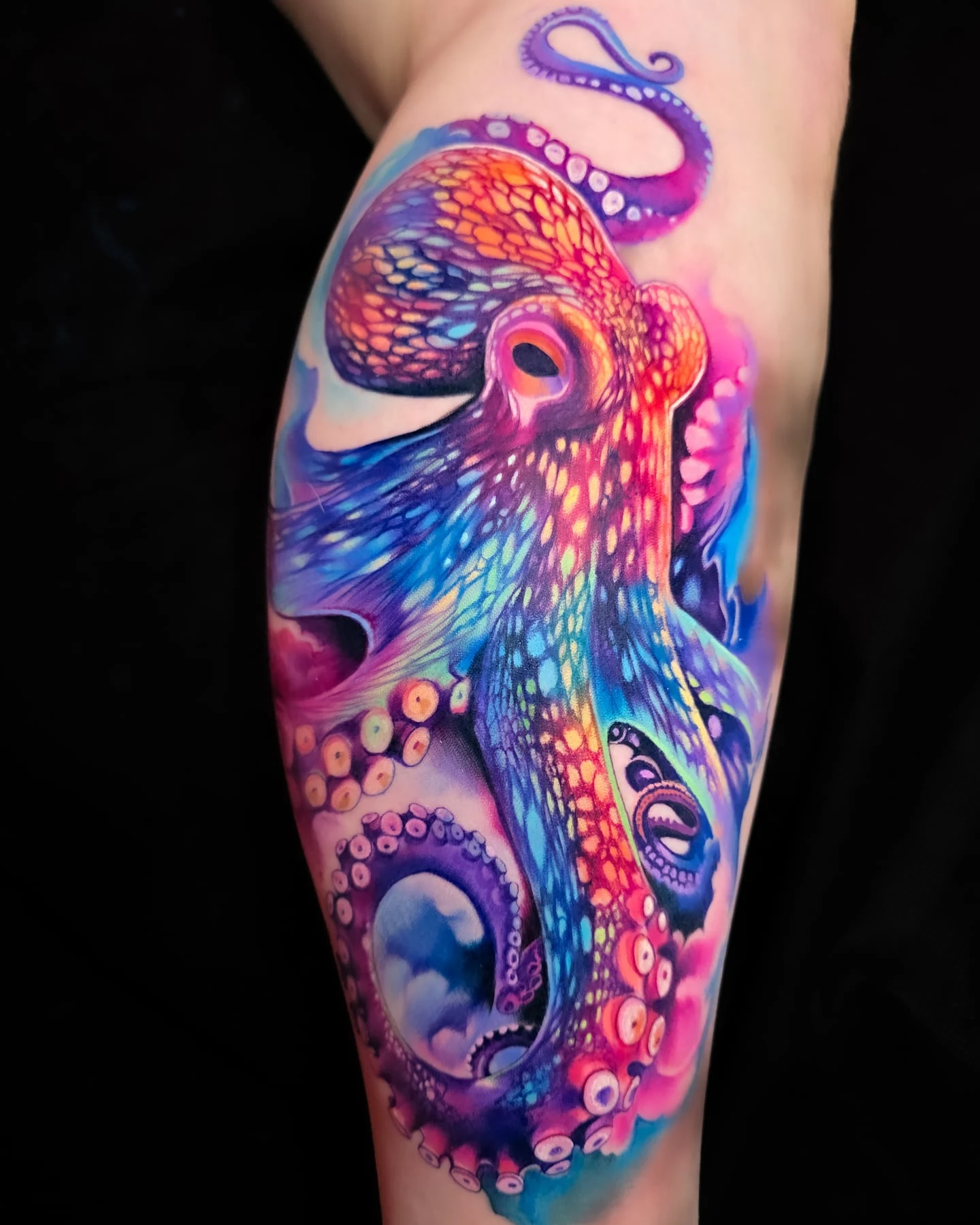 The artist kept the suction cups and details minimal, focusing on smooth curves and clean color transitions instead of realism. The thick black outline adds a classic tattoo feel, helping the colors pop against the skin.