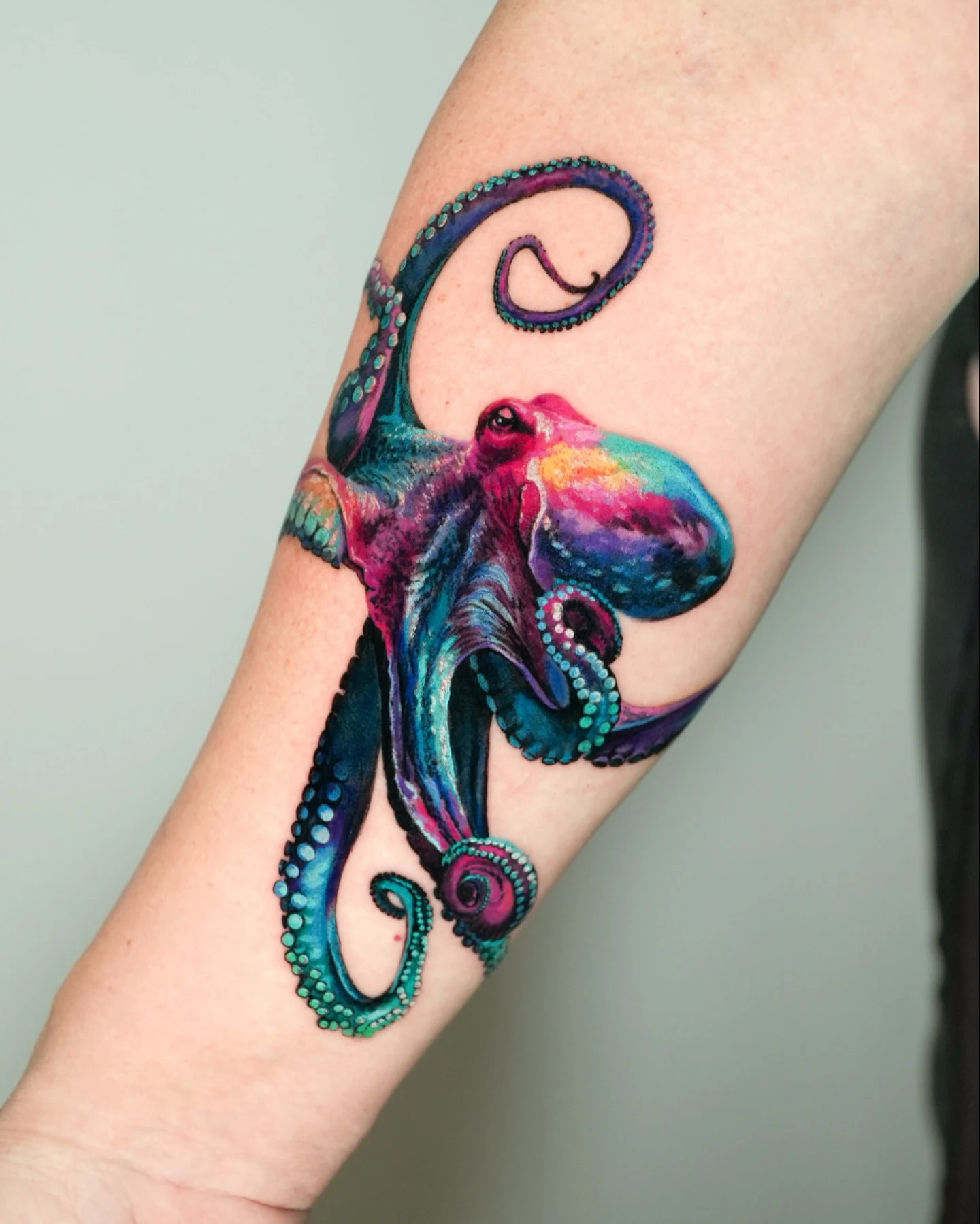 This bright forearm tattoo shows a vivid octopus created with bold blends of teal, purple, pink, and electric blue.