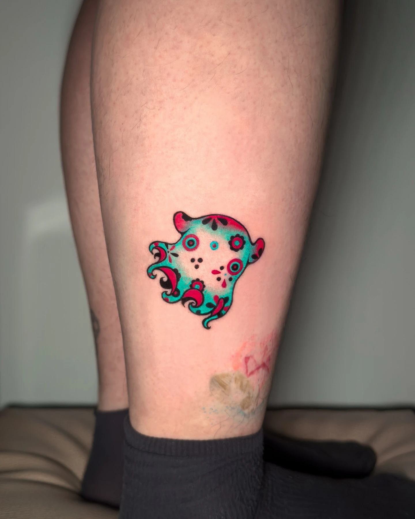 Its placement above an existing fish tattoo creates a fun underwater theme without the two designs blending together. It’s a striking piece for anyone who loves strong color and clean, readable shapes.