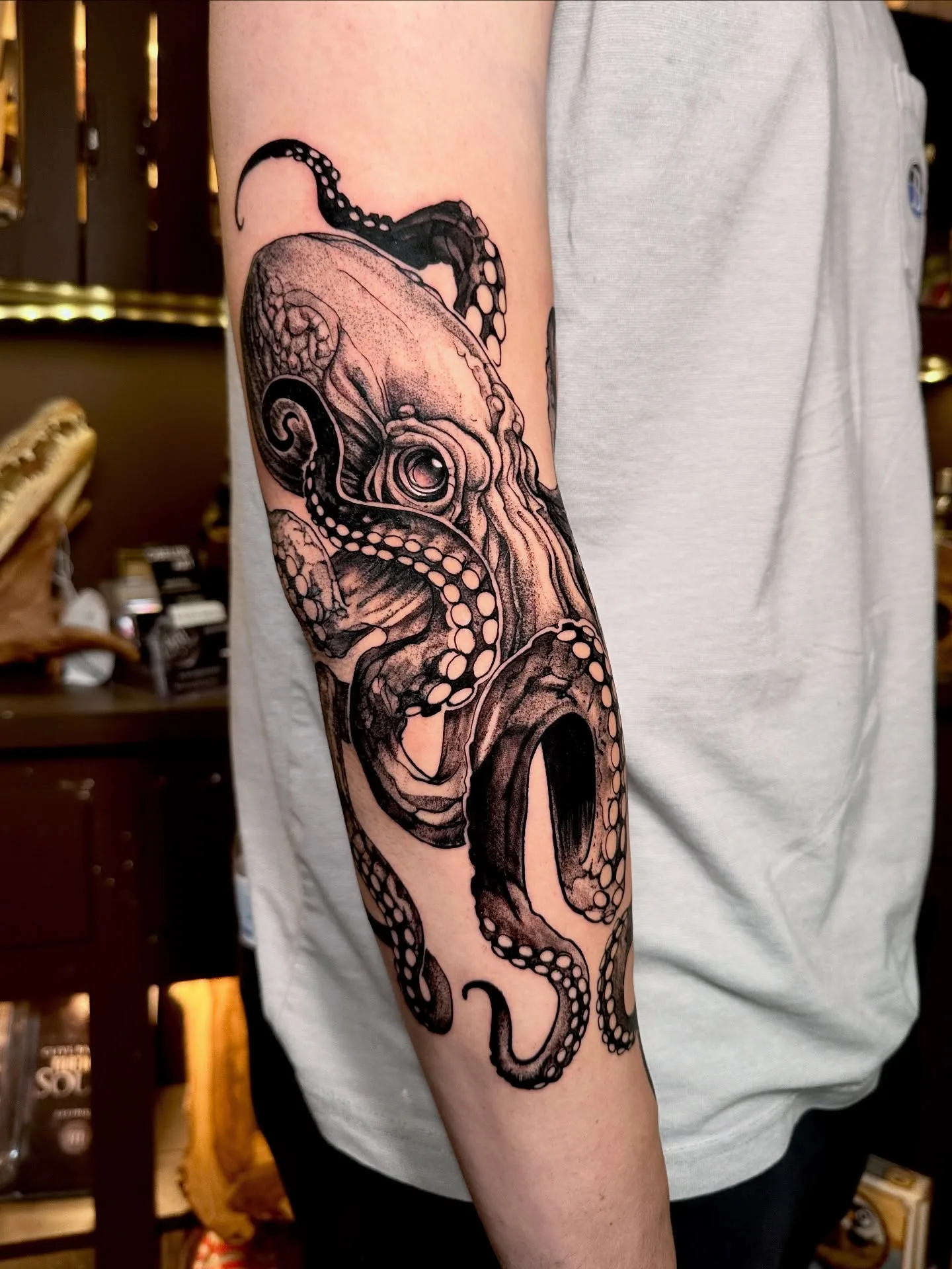 This blackwork octopus tattoo stretches from the upper arm to the forearm, using fine dot-shading and bold linework to build depth.