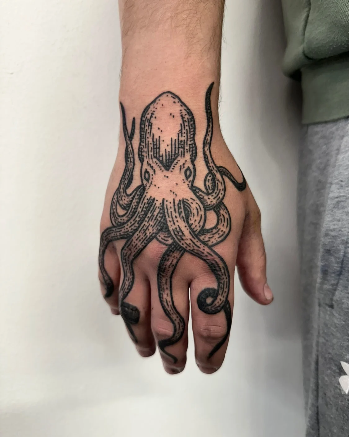 This bold hand tattoo places the octopus right across the knuckles, making it impossible to miss.