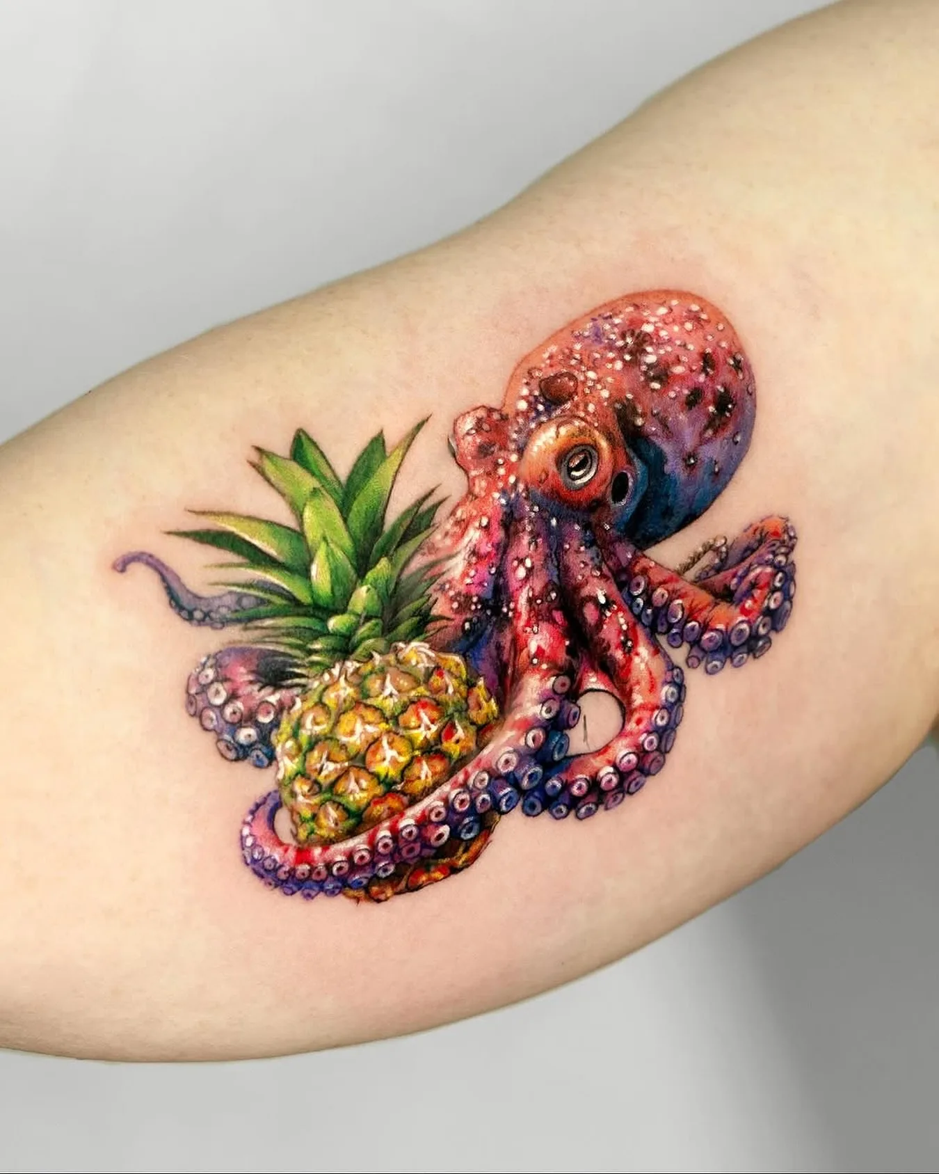 This playful tattoo shows a bright pink octopus wrapping its tentacles around a detailed pineapple, creating a fun mix of ocean and tropical themes.