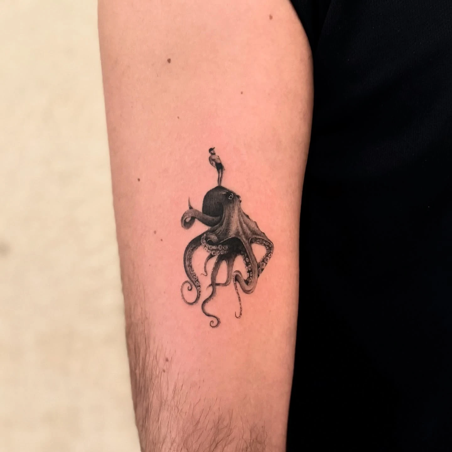 The octopus’s rounded head sits near the shoulder cap, while the tentacles curl down the bicep in layered coils.