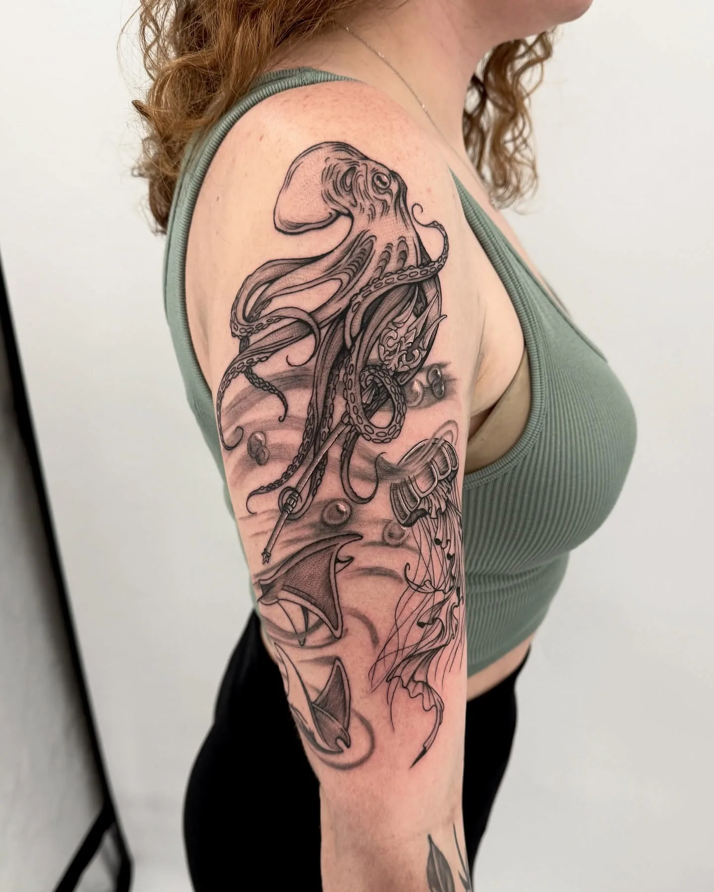 This upper-arm tattoo brings an underwater scene to life with a detailed octopus as the centerpiece.