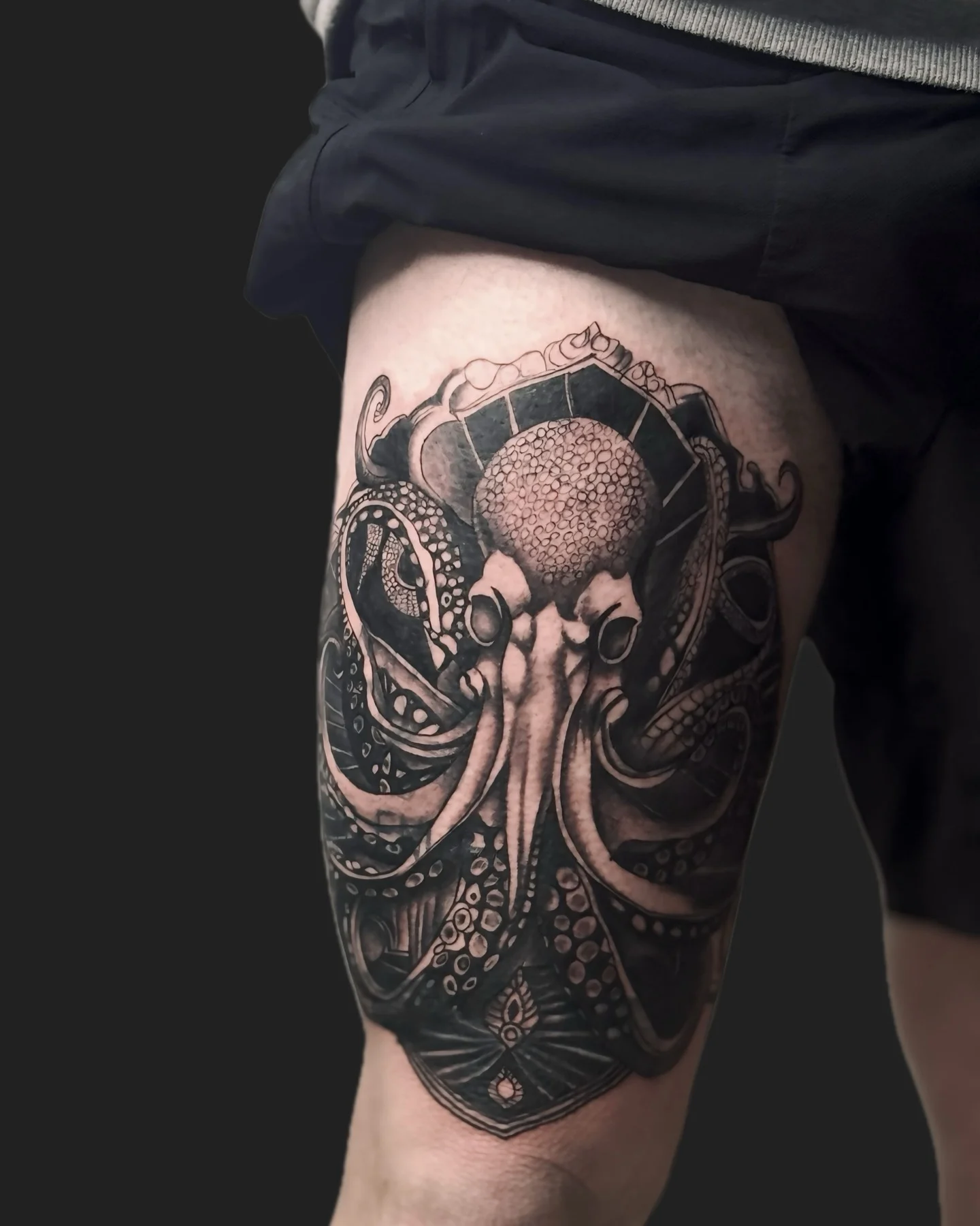 The octopus’s body sits over the knee, making the joint part of the design, while the tentacles stretch up the thigh and down the calf in smooth, natural curves.
