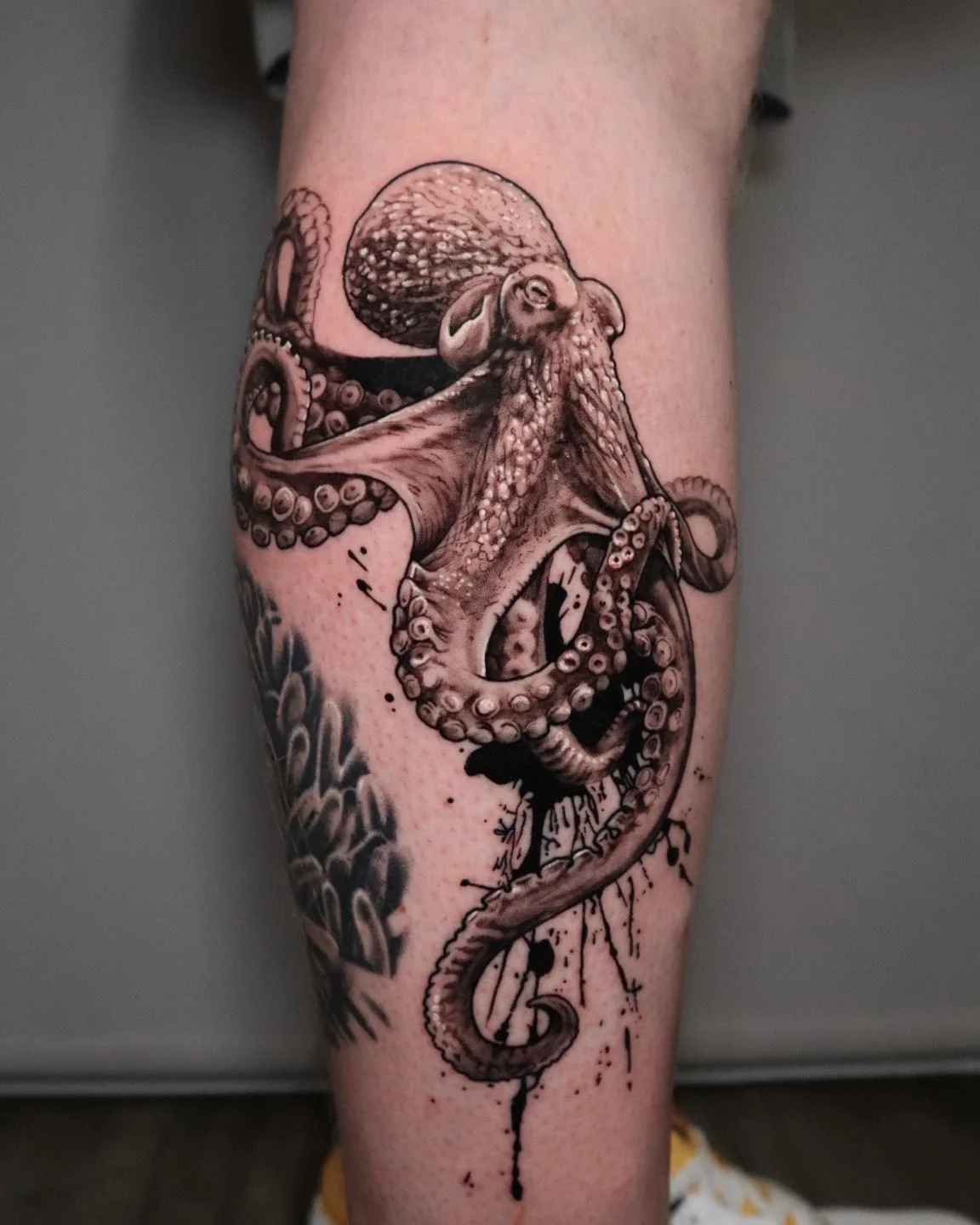 The tattoo balances darker shadows with soft highlights, making the octopus look three-dimensional from every angle. Its placement allows the tentacles to move visually when the leg bends, adding a dynamic feel to the piece.