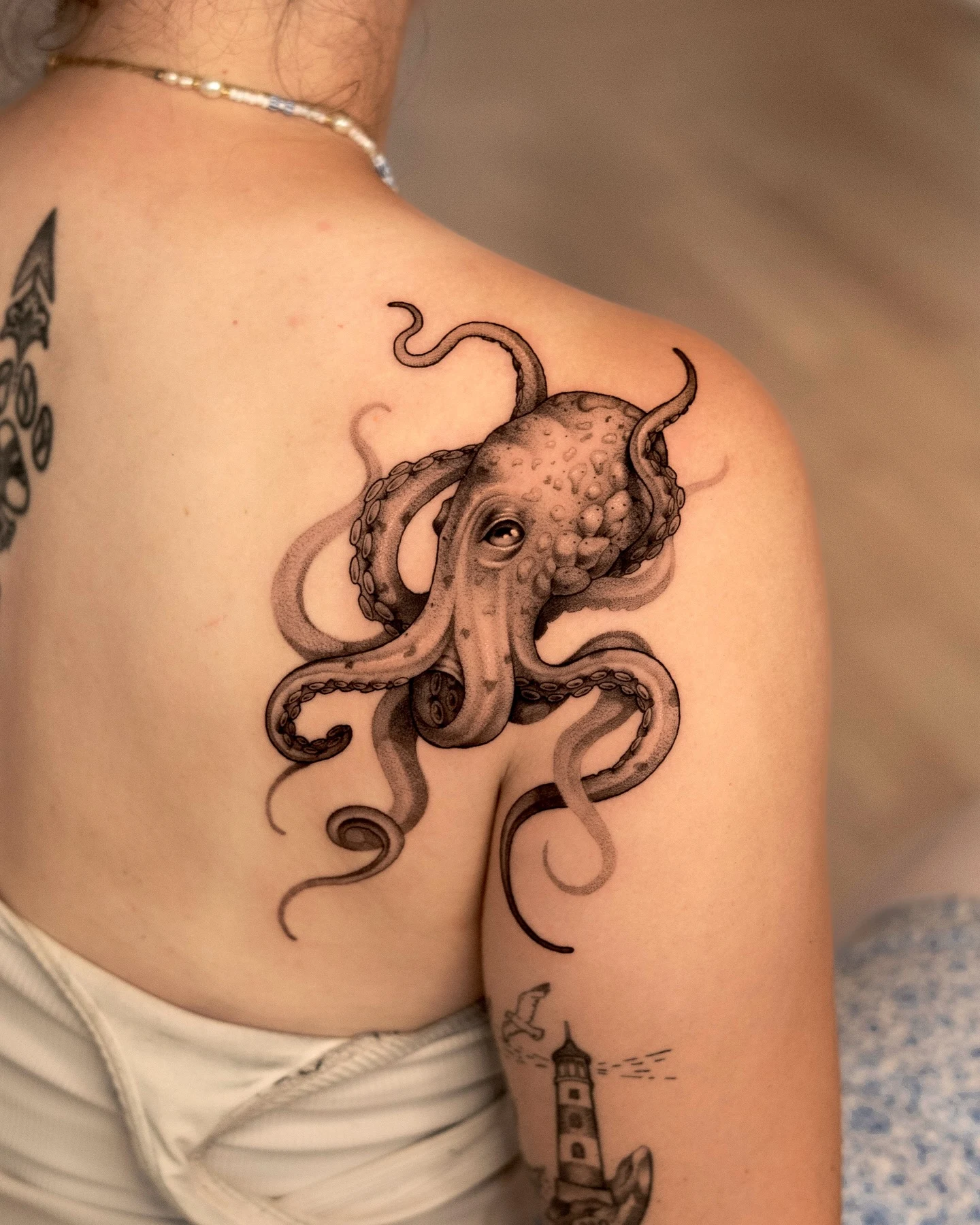 The octopus sits at the center, its tentacles stretching across the shoulder blade and down the back with smooth dot-shading and light texture.