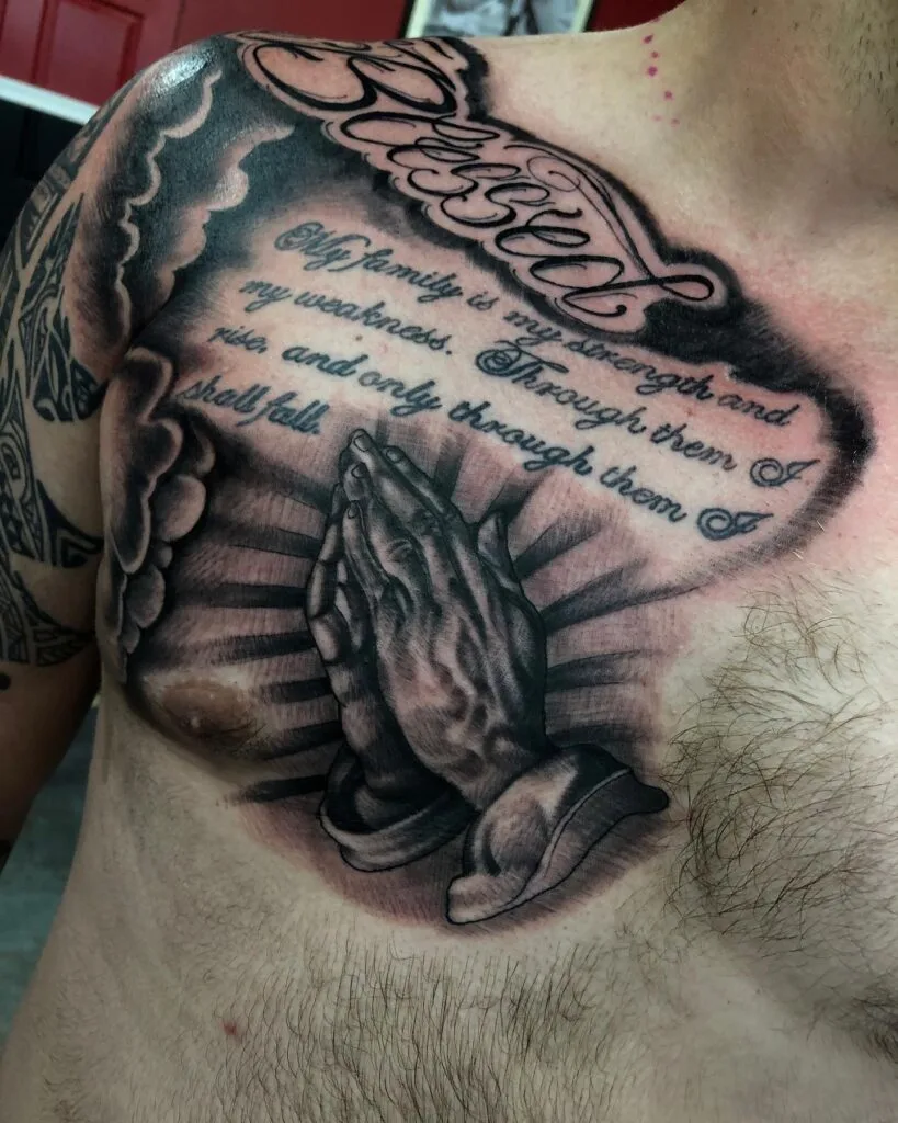 Blessed Chest Tattoo with Praying Hands and Family Quote
