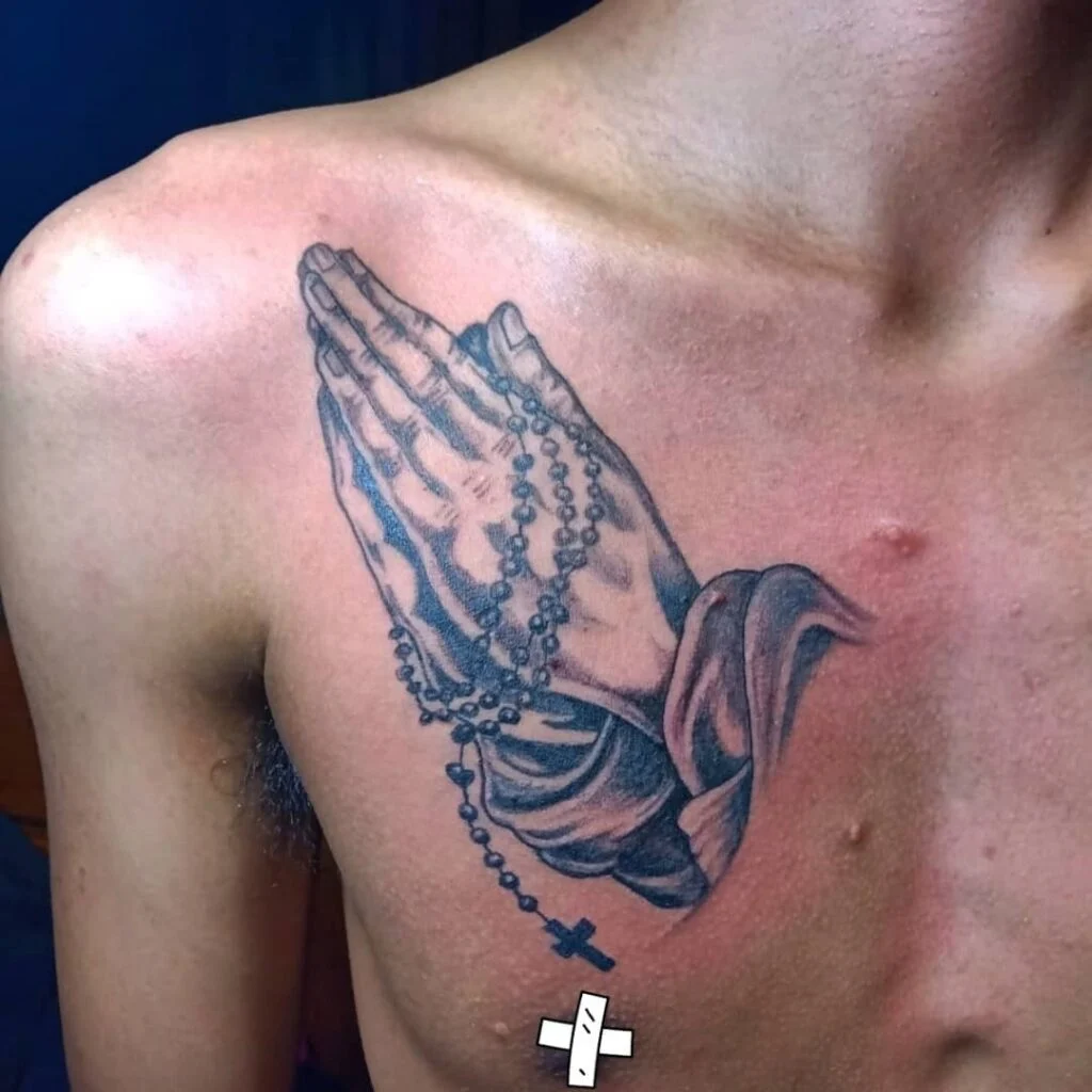 The shading work is smooth and precise, giving the hands a lifelike texture and the beads a dimensional, polished appearance. The folded cloth around the wrists adds a soft, traditional touch. Positioned over the heart, this tattoo serves as a deeply personal symbol of faith, devotion, and inner strength carried close to one’s core.