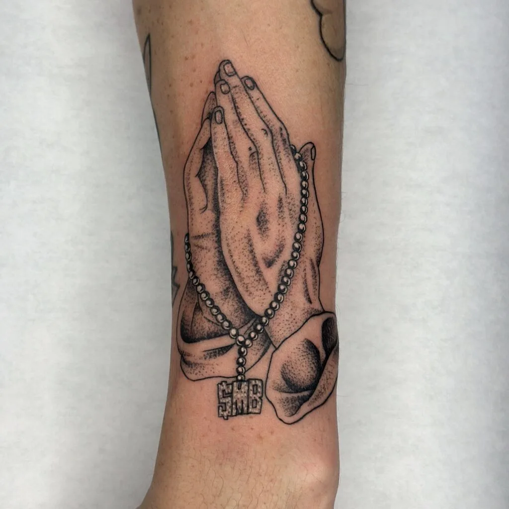 Draped over the hands is a carefully shaded rosary that ends in a custom pendant engraved with the initials “SMB,” adding a personal touch to the design. The use of stippling and clean outlines gives the piece a classic yet distinctive look. Perfect for the forearm, this tattoo combines faith, dedication, and identity in a bold and meaningful expression.
