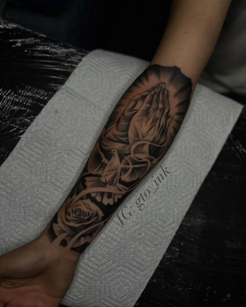 This stunning full-forearm tattoo features praying hands at the center, radiating beams of light from behind in a soft glow. Below the hands, two doves in flight symbolize peace and spiritual ascent, while a large, realistic rose near the wrist adds beauty and grounding.