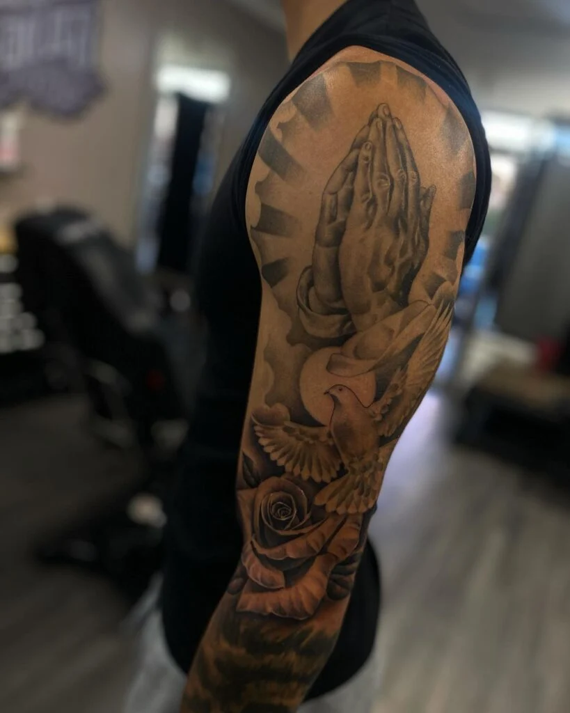Full Sleeve Praying Hands with Dove, Rose, and Light Rays Tattoo