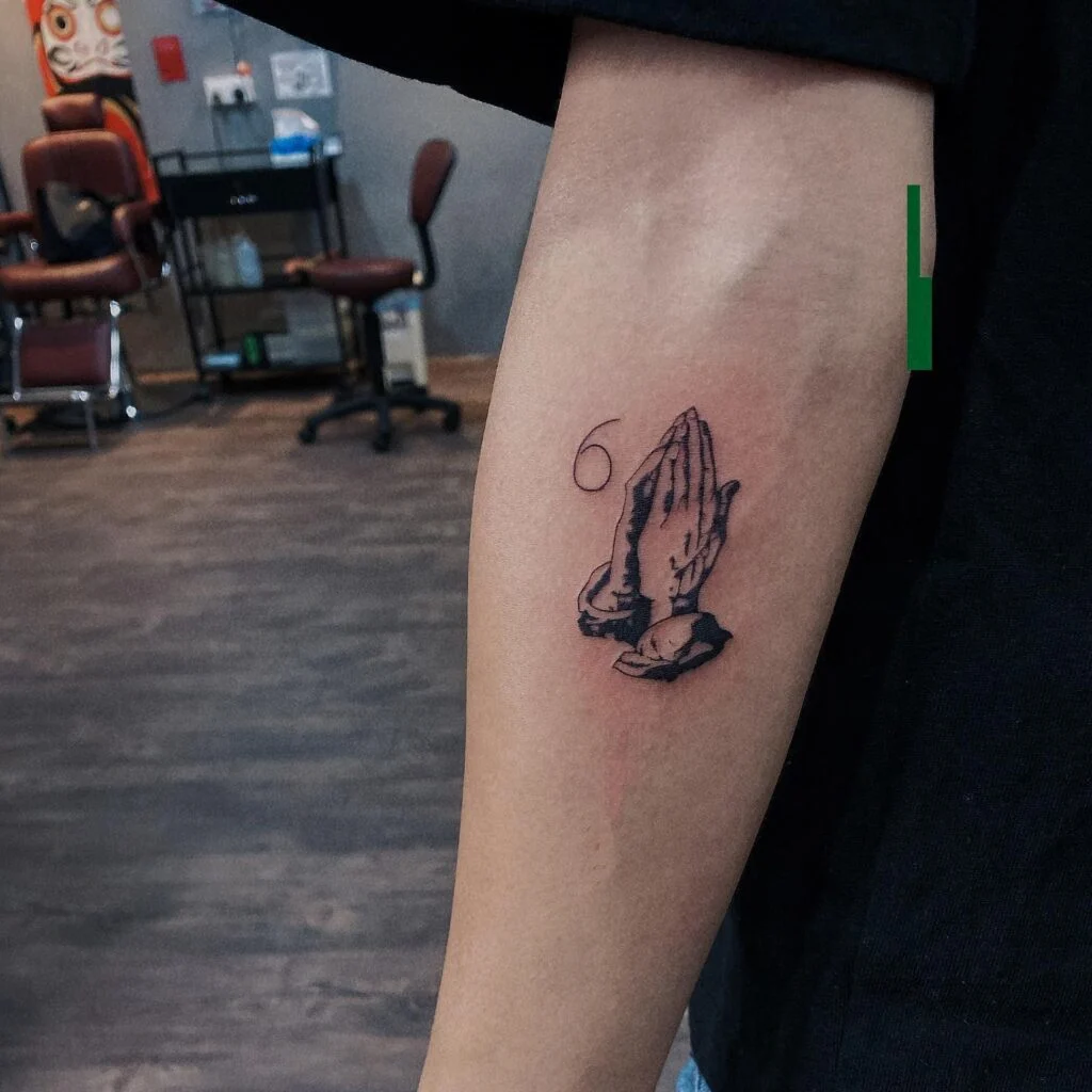 This simple yet meaningful forearm tattoo features a small pair of praying hands positioned next to the number “6.” Rendered in fine black ink with subtle shading, the design embraces a clean and minimalistic look.