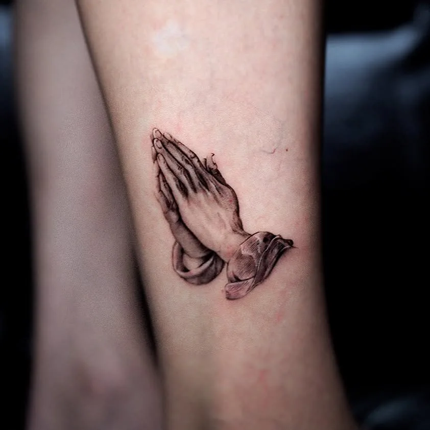 The folded cuffs at the wrists add just enough detail to give the piece dimension while keeping the overall style uncluttered. Ideal for those who prefer understated tattoos, this piece offers a quiet yet powerful expression of faith, humility, or personal strength.