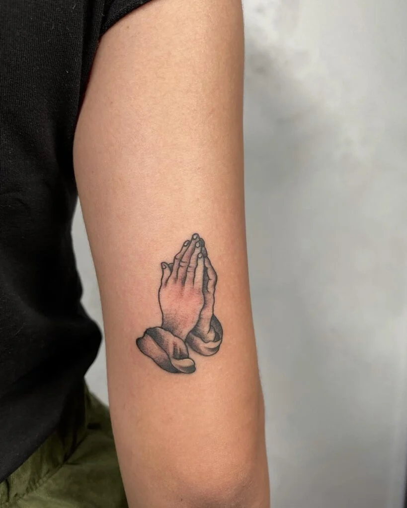 This subtle tattoo features a small pair of praying hands placed neatly on the upper arm. Rendered with soft black shading and gentle reddish tones, it captures a sense of humility and spiritual devotion without being overly detailed.