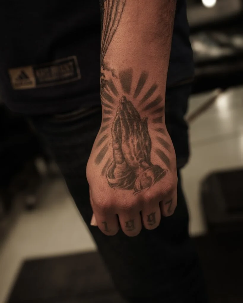 This bold hand tattoo features the classic image of praying hands centered on the back of the hand, surrounded by radiating beams that create a halo-like effect. The detailed shading in the hands and sleeves adds realism, while the radiant lines emphasize spiritual energy or divine connection.