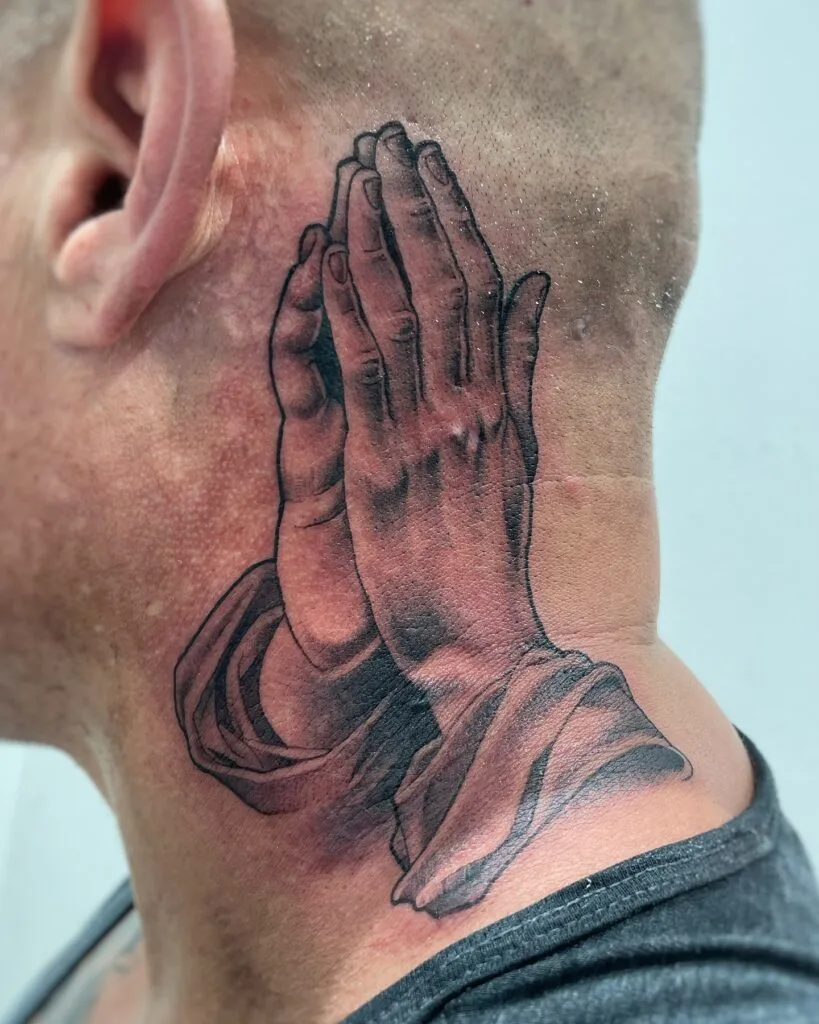 This tattoo places the iconic praying hands design along the side of the neck, blending religious symbolism with bold placement. The hands are detailed with deep black and gray shading that emphasizes anatomical structure and cloth folds, creating a sense of depth.