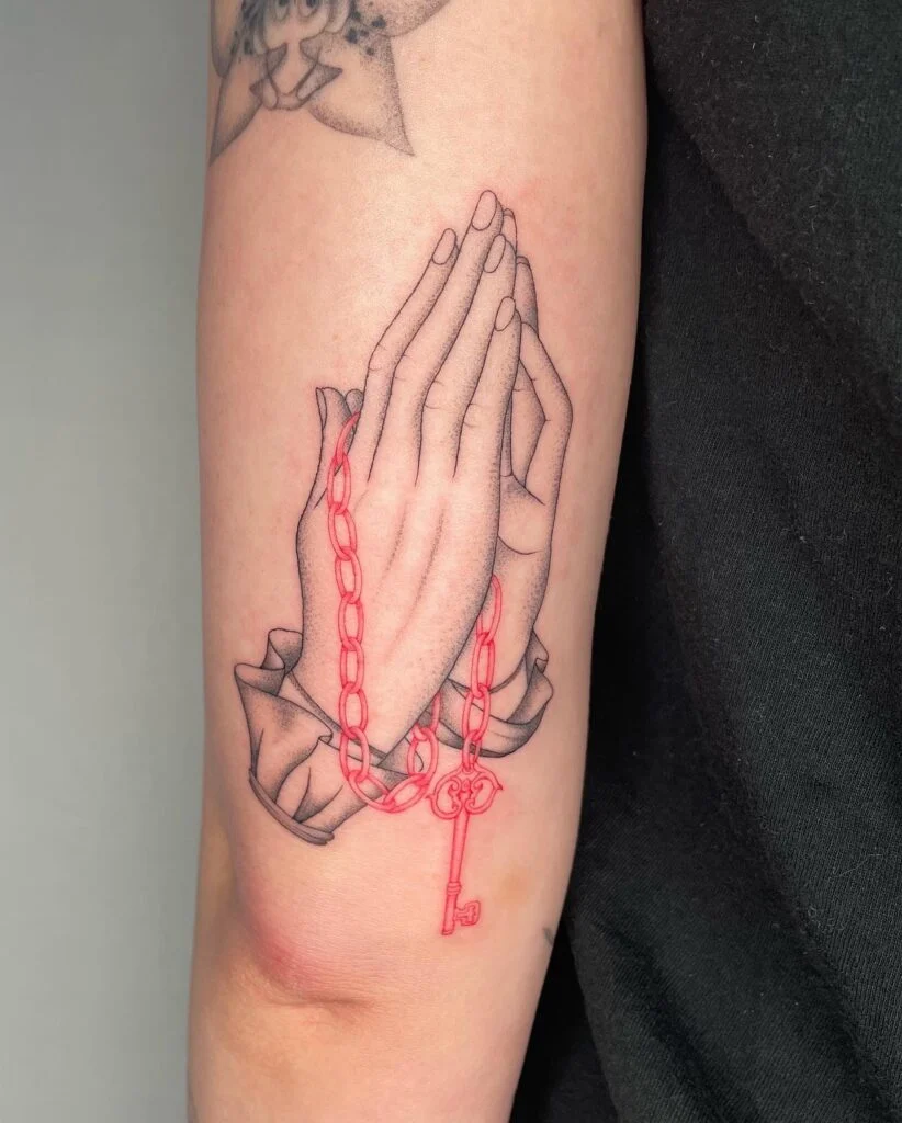 This tattoo features a pair of praying hands outlined in fine black ink, contrasted by a bold red chain draped over the wrists. At the end of the chain hangs a delicate key, also in red, adding a unique and symbolic element.