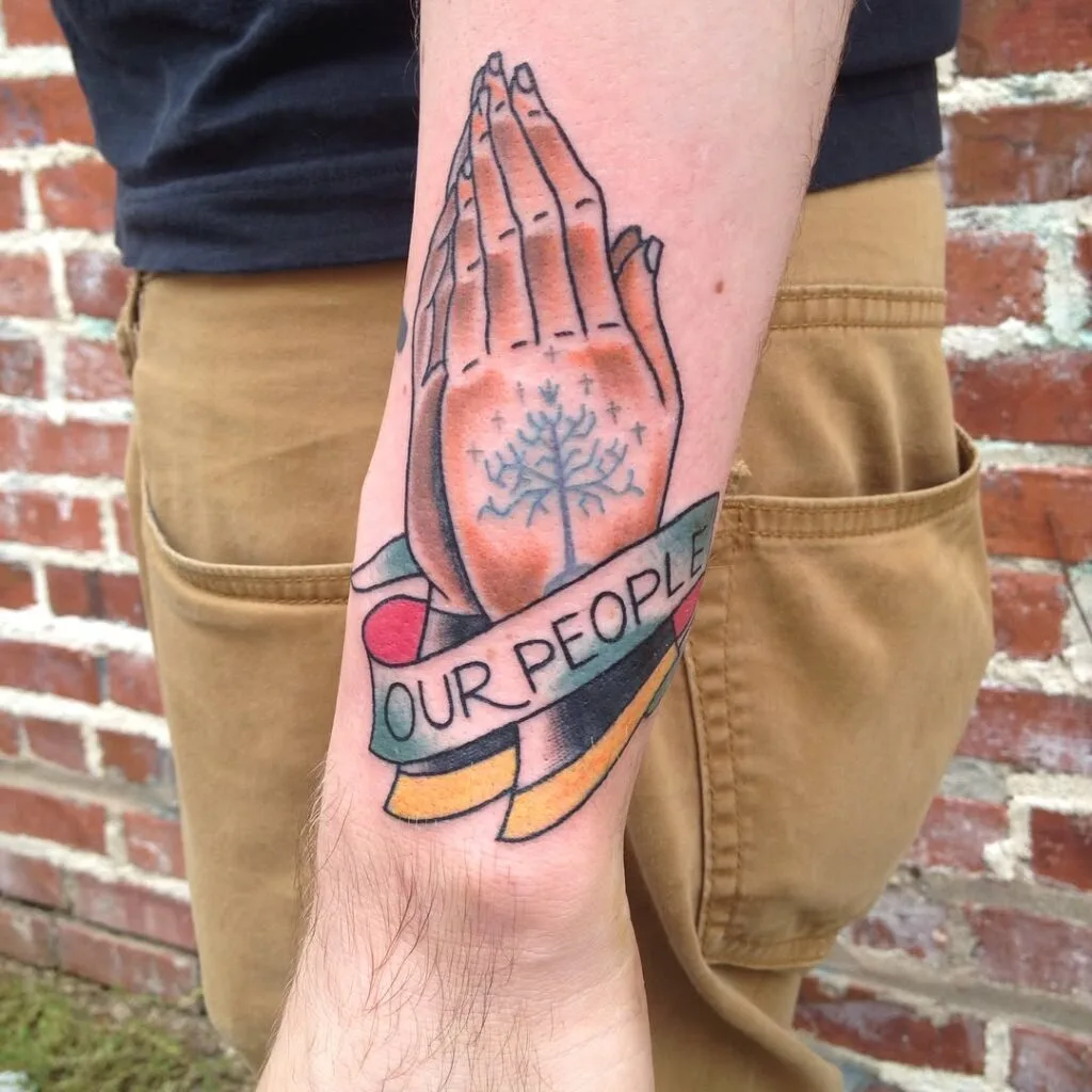 Praying Hands Tattoo with Tree and “Our People” Banner